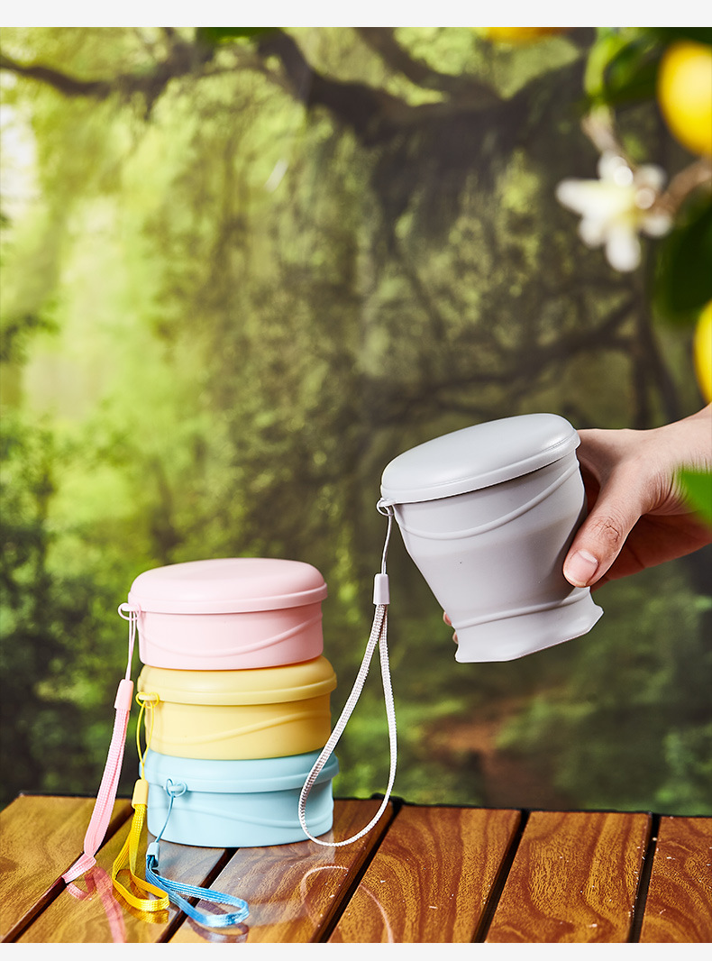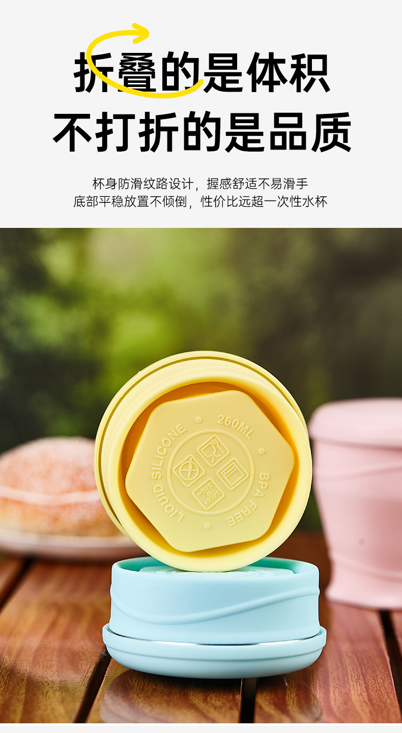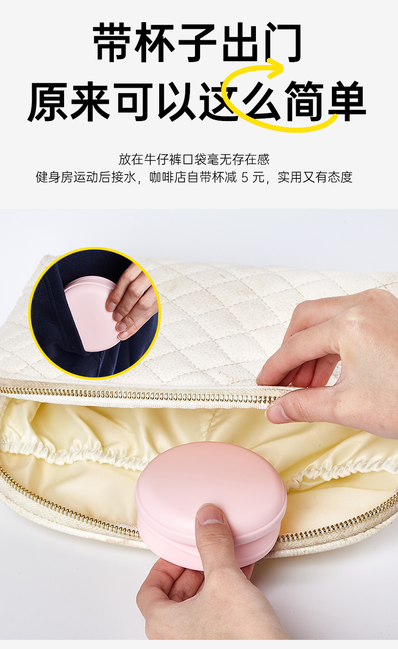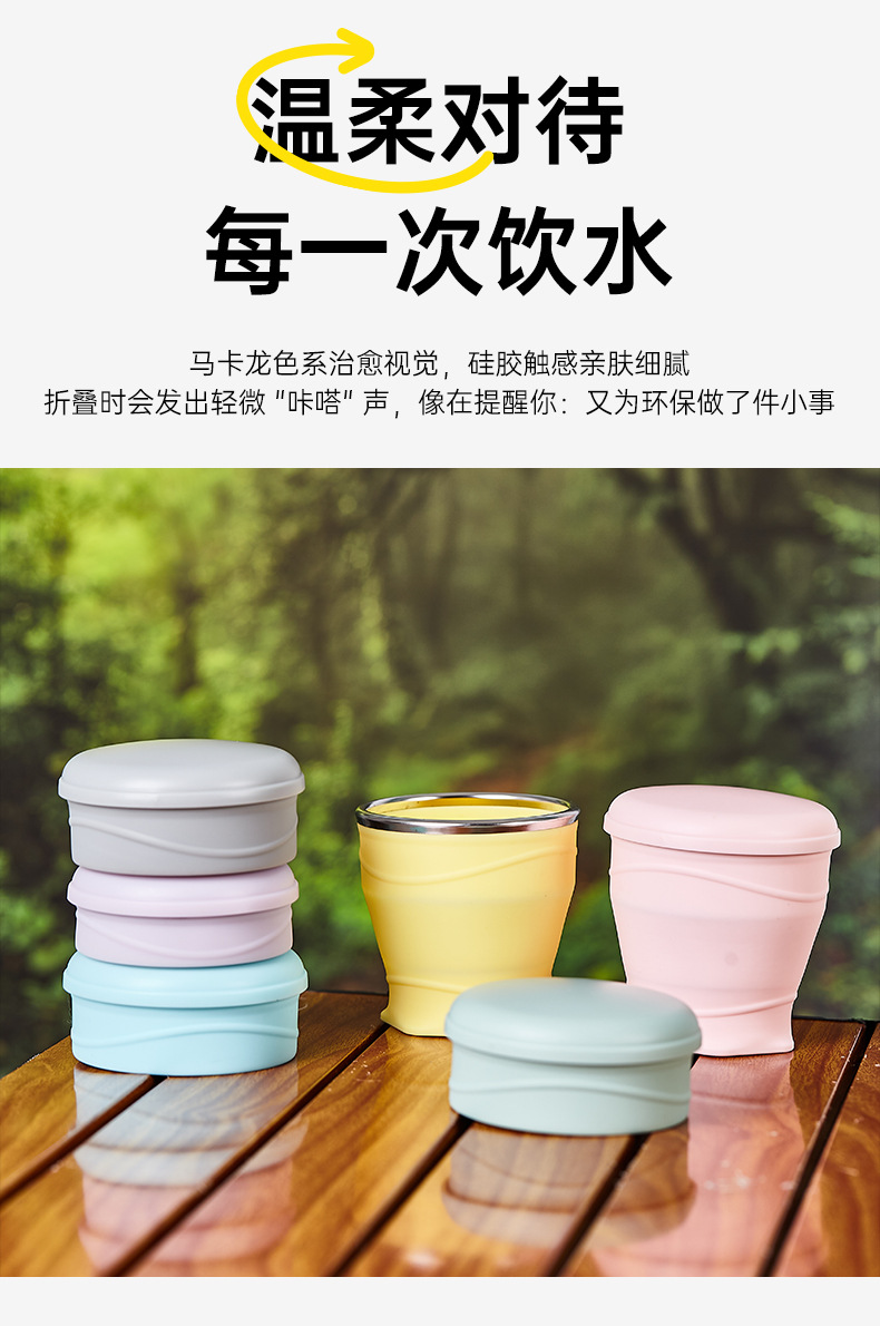 马卡龙口袋杯(S22)参数:1.材质:食品级硅胶+304不锈钢 2.尺寸:87*140(58)mm 彩盒尺寸:76*76*73(30)cm 3.容量:180ml 4.重量:68g 5.包装:OPP袋(彩盒+0.2元)