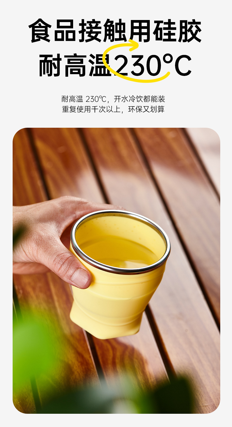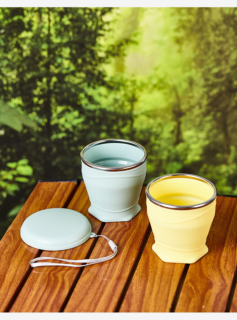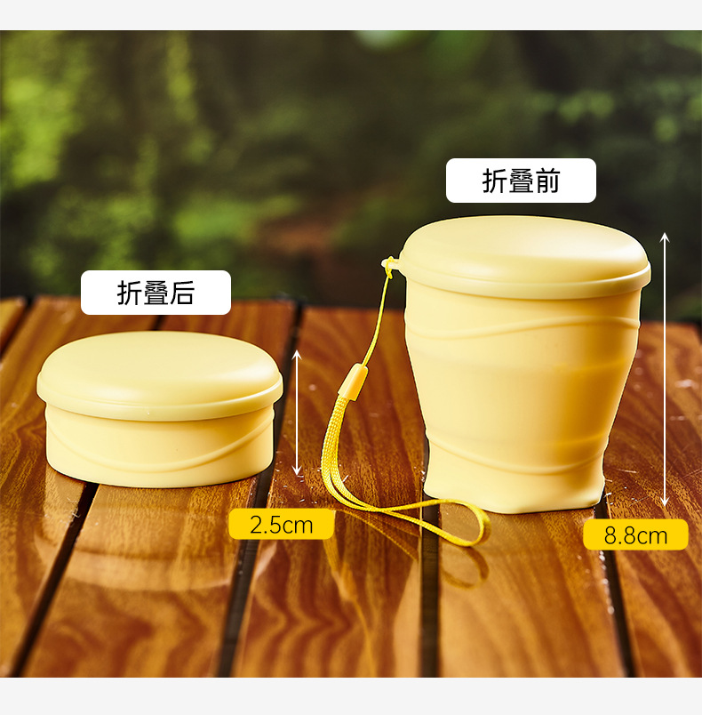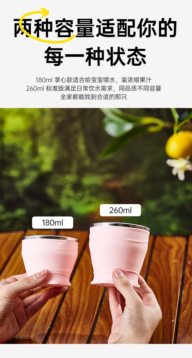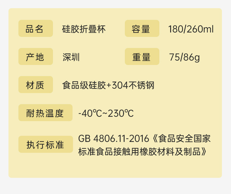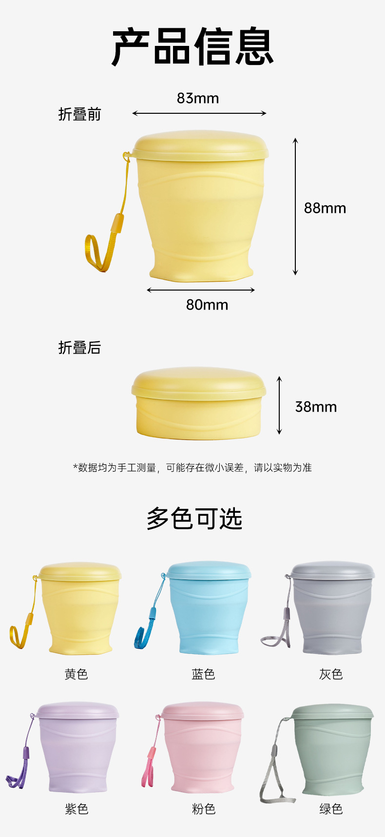 马卡龙口袋杯(S22)参数:1.材质:食品级硅胶+304不锈钢 2.尺寸:87*140(58)mm 彩盒尺寸:76*76*73(30)cm 3.容量:180ml 4.重量:68g 5.包装:OPP袋(彩盒+0.2元)