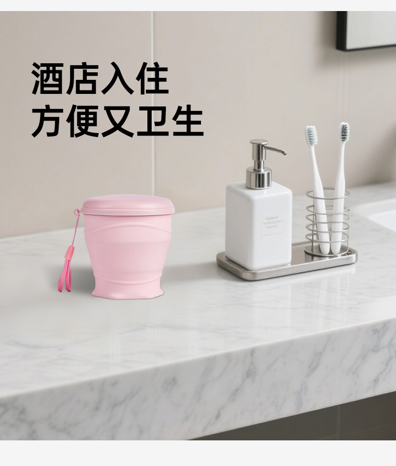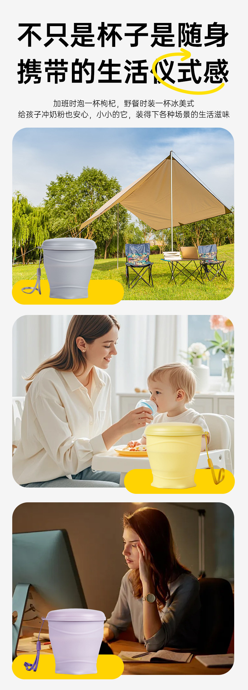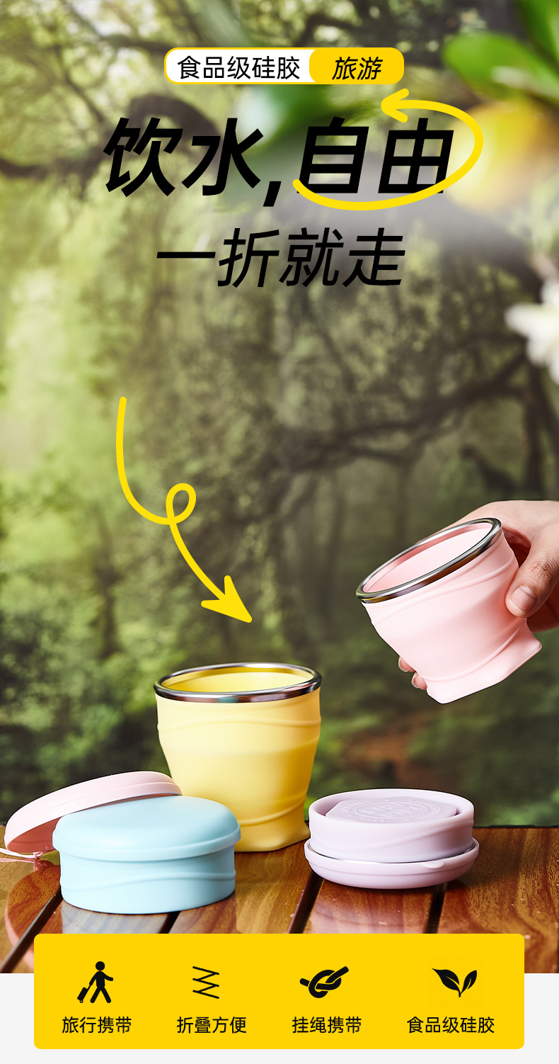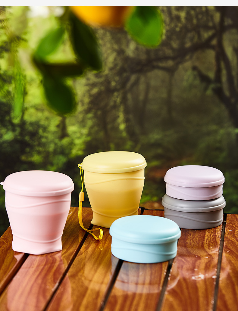 马卡龙口袋杯(S22)参数:1.材质:食品级硅胶+304不锈钢 2.尺寸:87*140(58)mm 彩盒尺寸:76*76*73(30)cm 3.容量:180ml 4.重量:68g 5.包装:OPP袋(彩盒+0.2元)