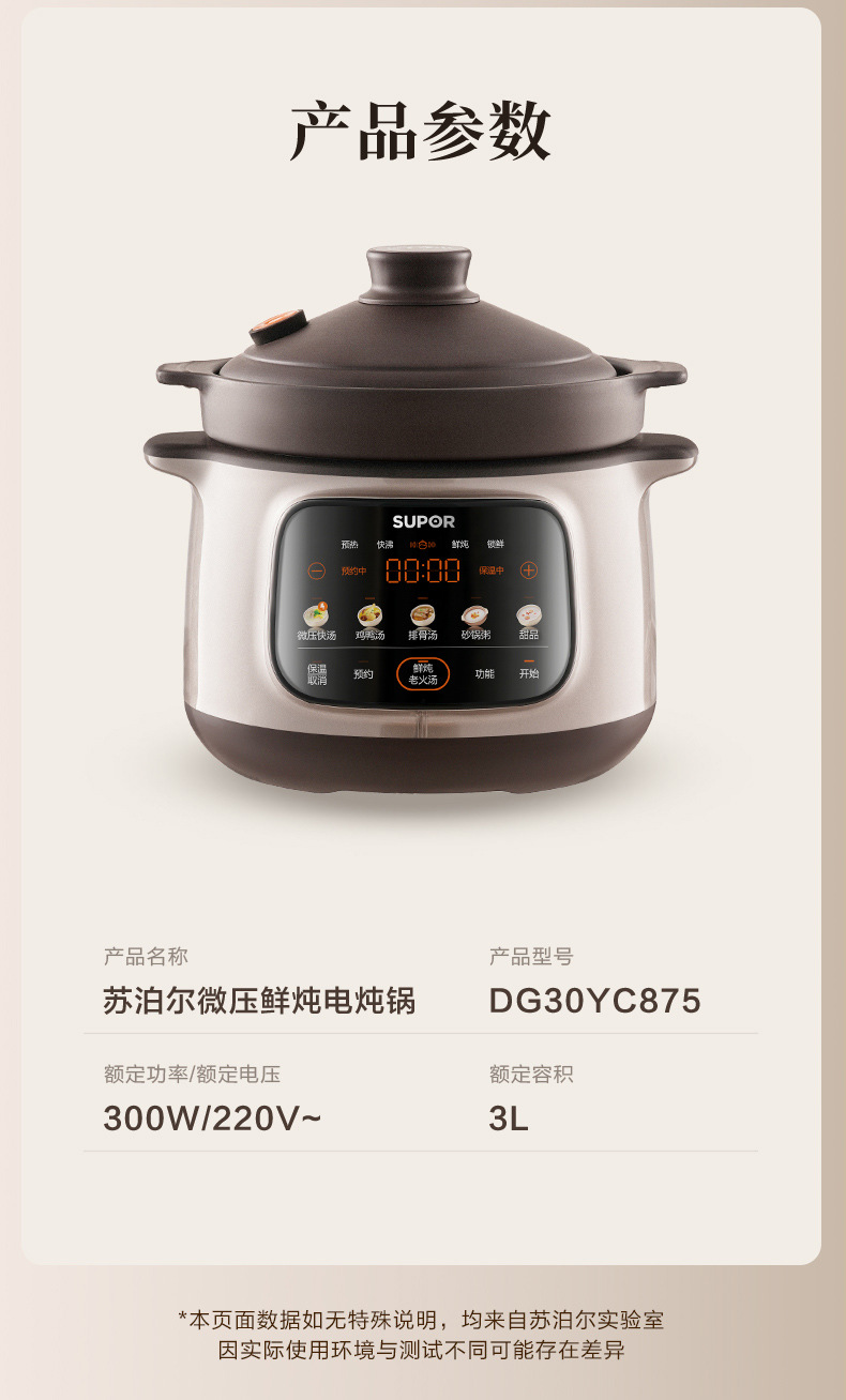 蘇泊爾電気煮込み鍋3L煮込みスープ煮込み杯紫陶知能予約陶磁器養生煮込み鍋DG30YC816