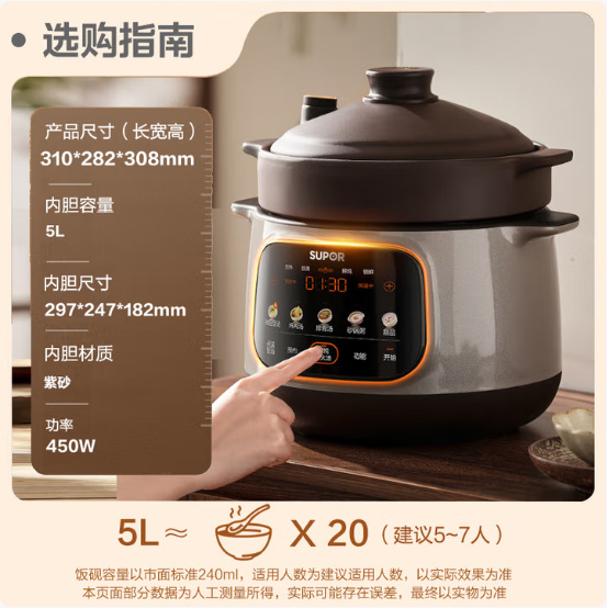 苏泊尔紫砂电炖锅家用5L大容量盅陶瓷全自动煲汤多功能DG50YC887