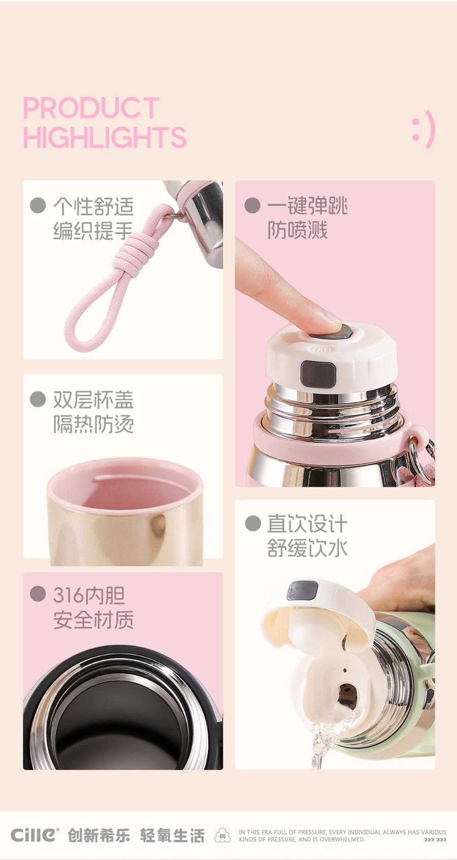 希乐保温杯女生316不锈钢水杯儿童上学专用大容量杯子学生水壶