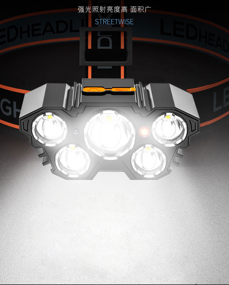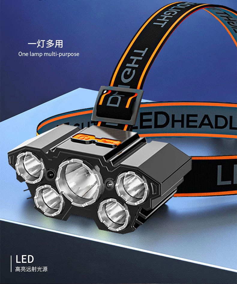 跨境强光5头灯户外LED长续航夜钓鱼远射泛光灯头戴式便携式小头灯