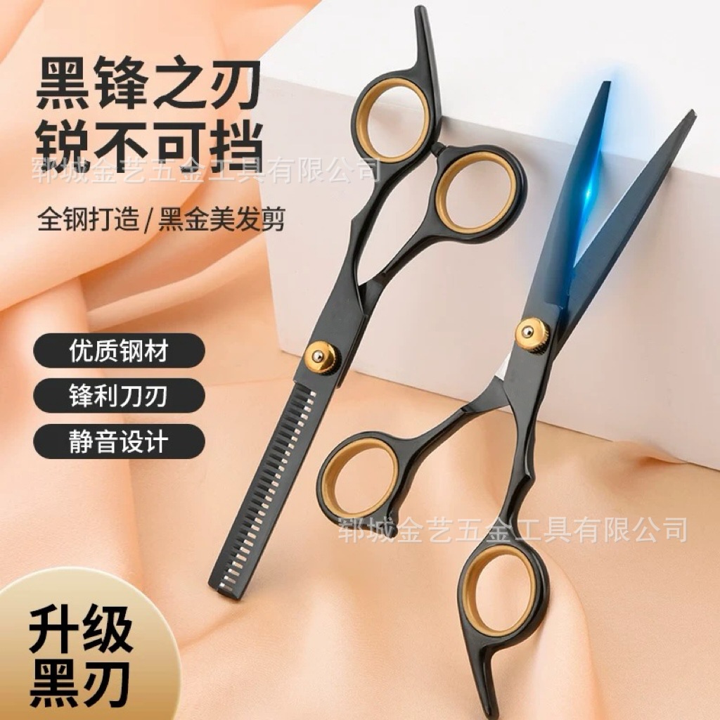 クロスボーダー黒と黄色のプロの理髪はさみ前髪をカットするためのフラット歯はさみ薄型はさみセットツールヘアカットはさみ
