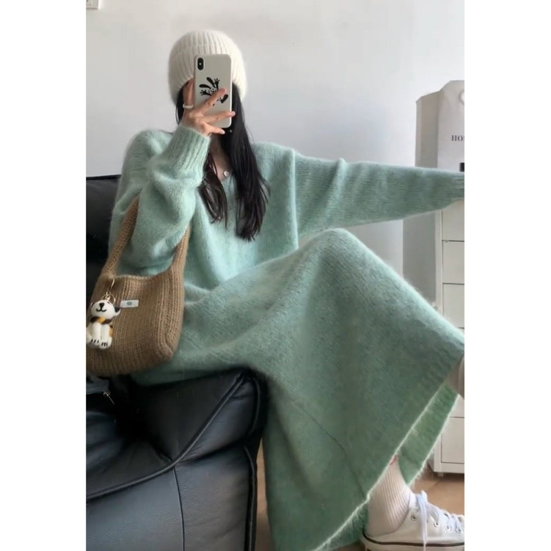 2025年秋冬新作、ゆったりとしたロング丈のニットワンピース、フレンチスタイルのニット素材で膝下まで届く厚手のワンピース