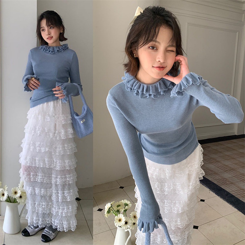 甜美减龄荷叶领双层花边翻领修身针织衫气质显瘦轻薄打底衫女上衣