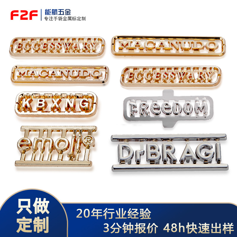 電気メッキバッグ文字ロゴ金属ラベル、バッグ用金具、亜鉛合金ラベル、衣料品ハンドバッグ用金属ラベル、カスタムメイド