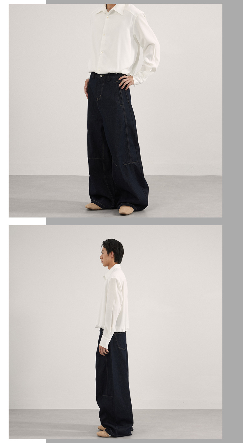 JIAMU美式高街拼接原牛baggy jeans中性镰刀裤阔腿弯刀牛仔裤男女