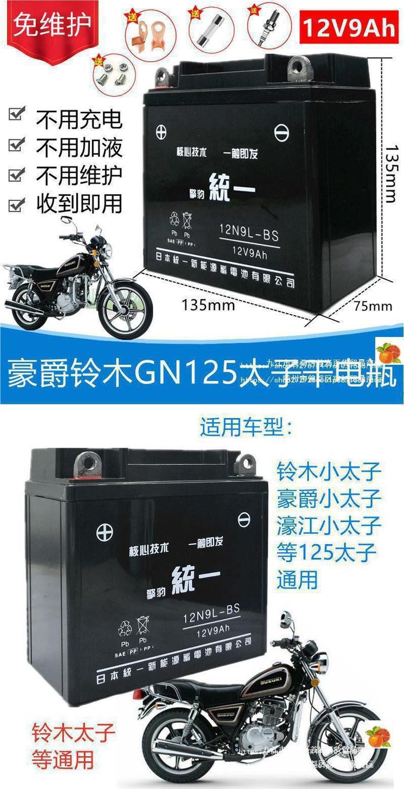 豪爵铃木GN太子HJ125-8男士摩托车免维护蓄电池12V9A干电瓶遂潘