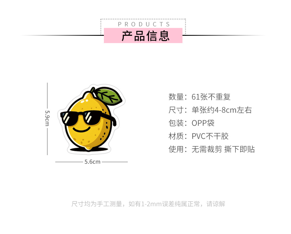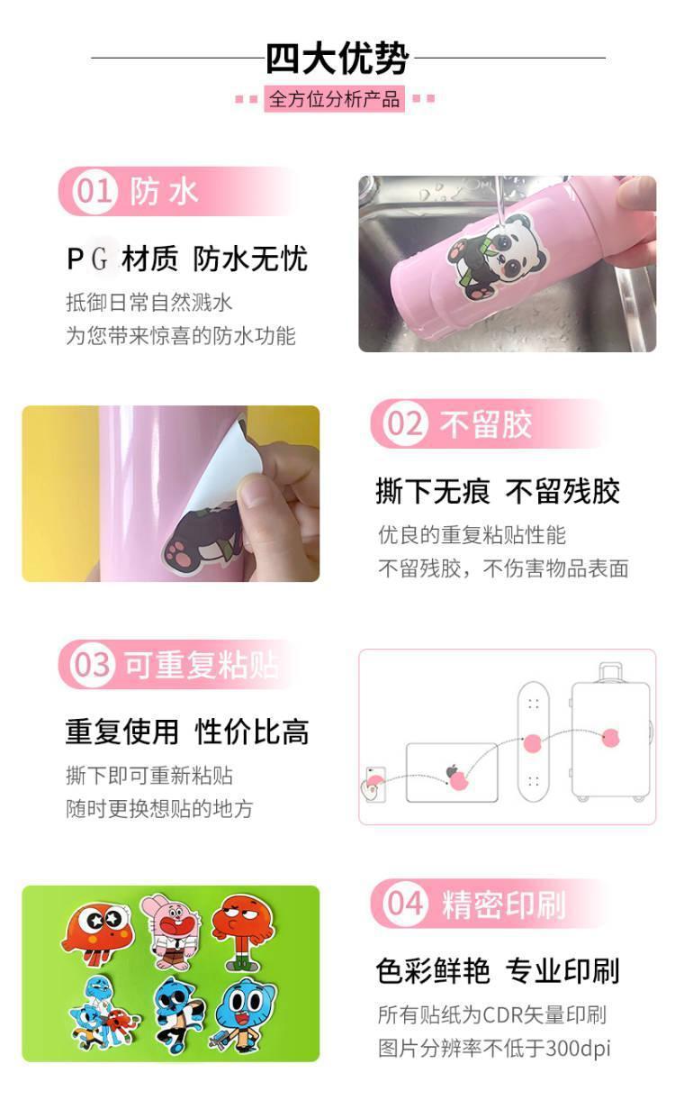 产品采用防水材质,进口海德堡高清印刷、覆膜,贴纸按形状模切完好,不用担心自己裁剪地歪歪扭扭