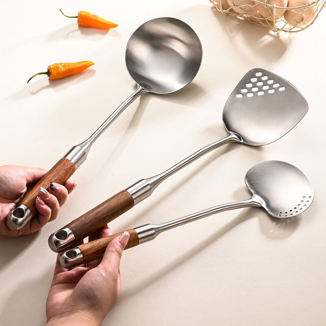 炒菜铲勺316不锈钢花梨木锅铲汤勺漏勺家用饭店煎铲蘑菇铲套装