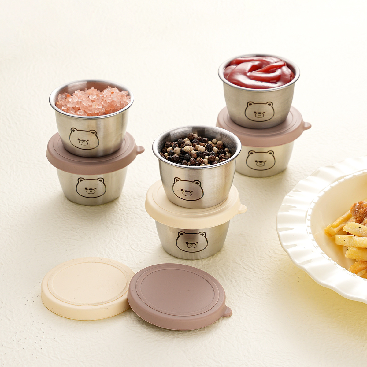 ミニポータブルソースカップ調味料ボックス漫画クマソーサー蓋付きトマトサラダソースカップ 304 ステンレス鋼