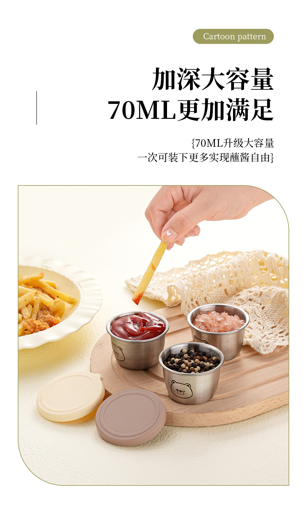 304不锈钢酱汁杯激光小熊70ml蘸料杯硅胶盖零食盒户外便携调味碟