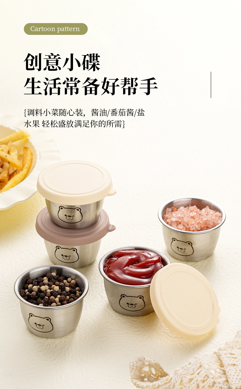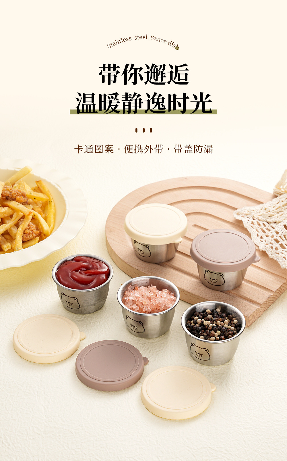 小熊304不锈钢蘸料盒带盖调味密封小料杯沙拉番茄酱便携保鲜容器
