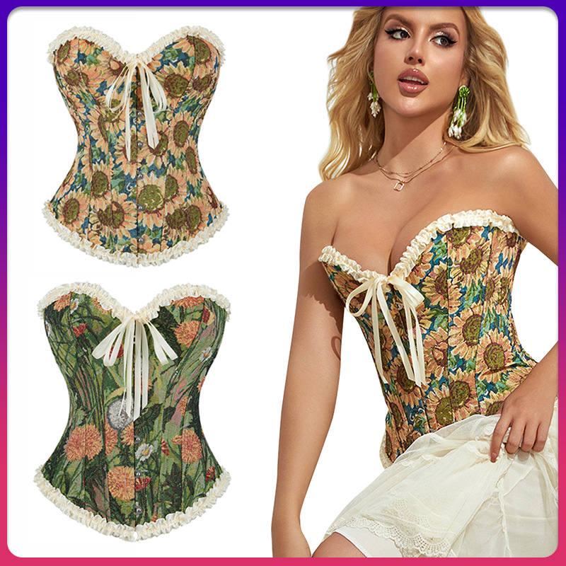 Temuの供給源のヒマワリのボディスーツのゴッホの油絵の図案のシリーズの欧米の復古風のレースの魚の骨の上着