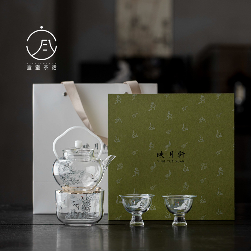 宜室茶話松鶴ガラスティーポットろうそく台加熱ベース煮茶炉一壺二杯茶具セットプレゼント