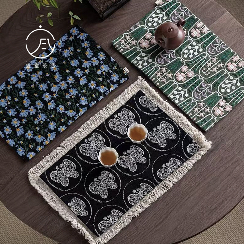 Yishi Tea House 中国風花刺繍ドライバブルマット デイジー中国茶室ティーテーブルテーブルクロス タッセルティーマット ティーマット
