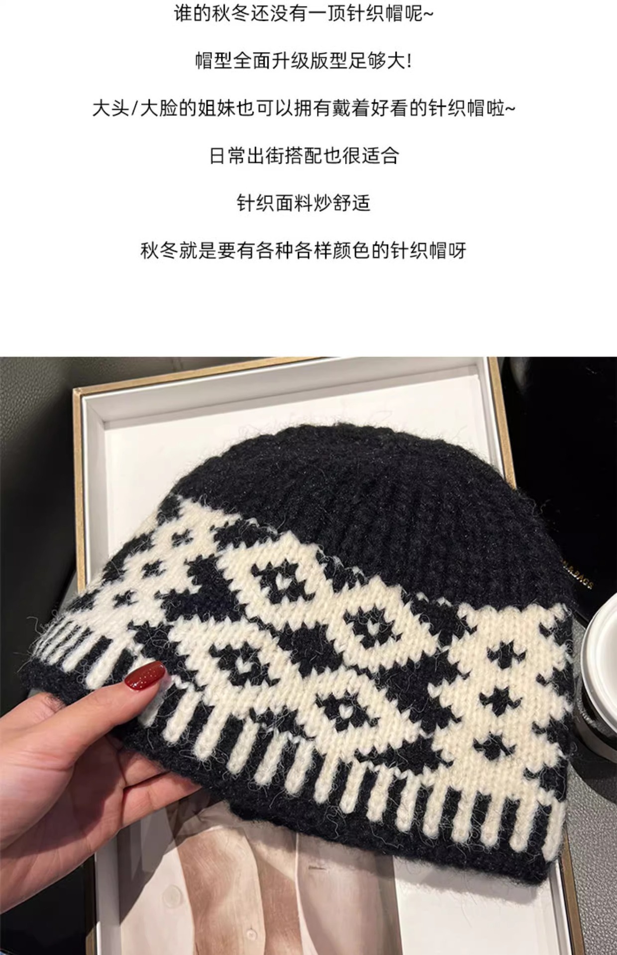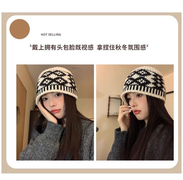 韩版复古菱形格针织毛线帽新款女秋冬季大头围时尚百搭显脸小冷帽