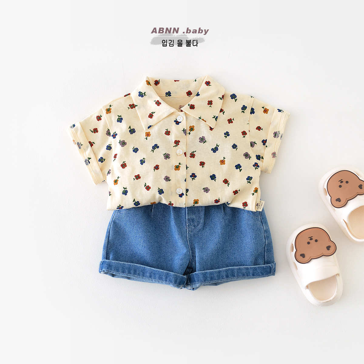 越己服飾2025夏の韓国版子供用アルファベット折り襟上着子供用半袖ネクタイシャツ52073