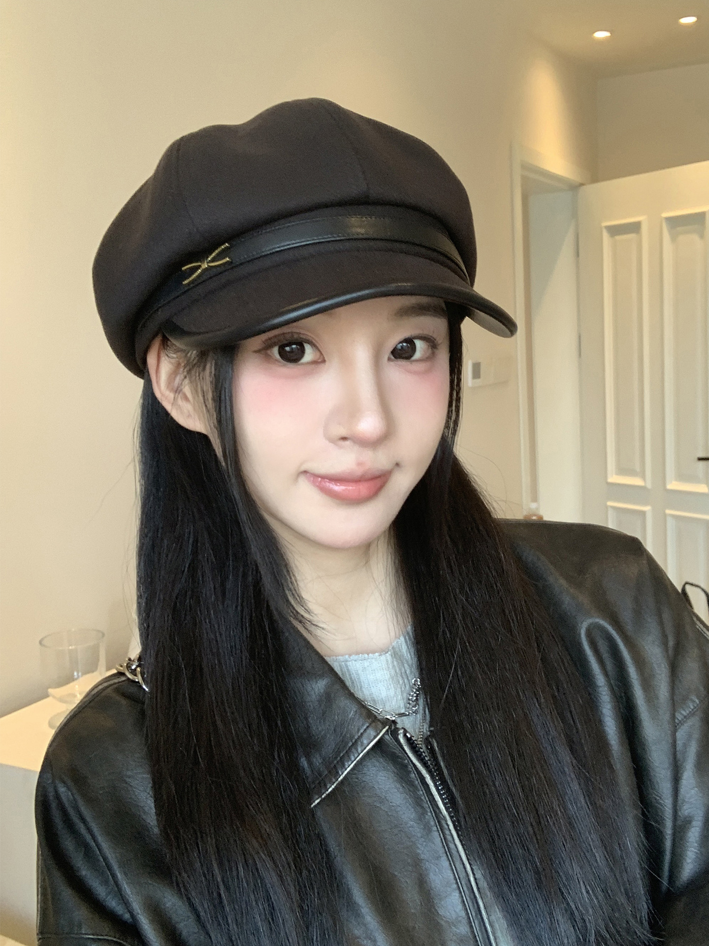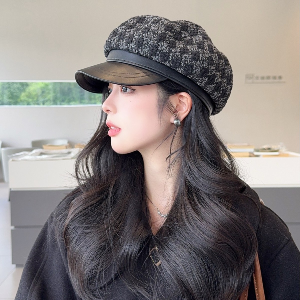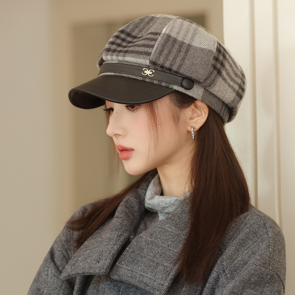 韩版经典小香格纹pu皮拼接八角帽子女春秋季出游百搭显脸小画家帽