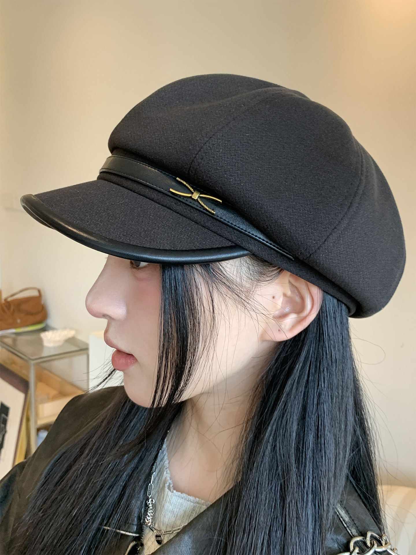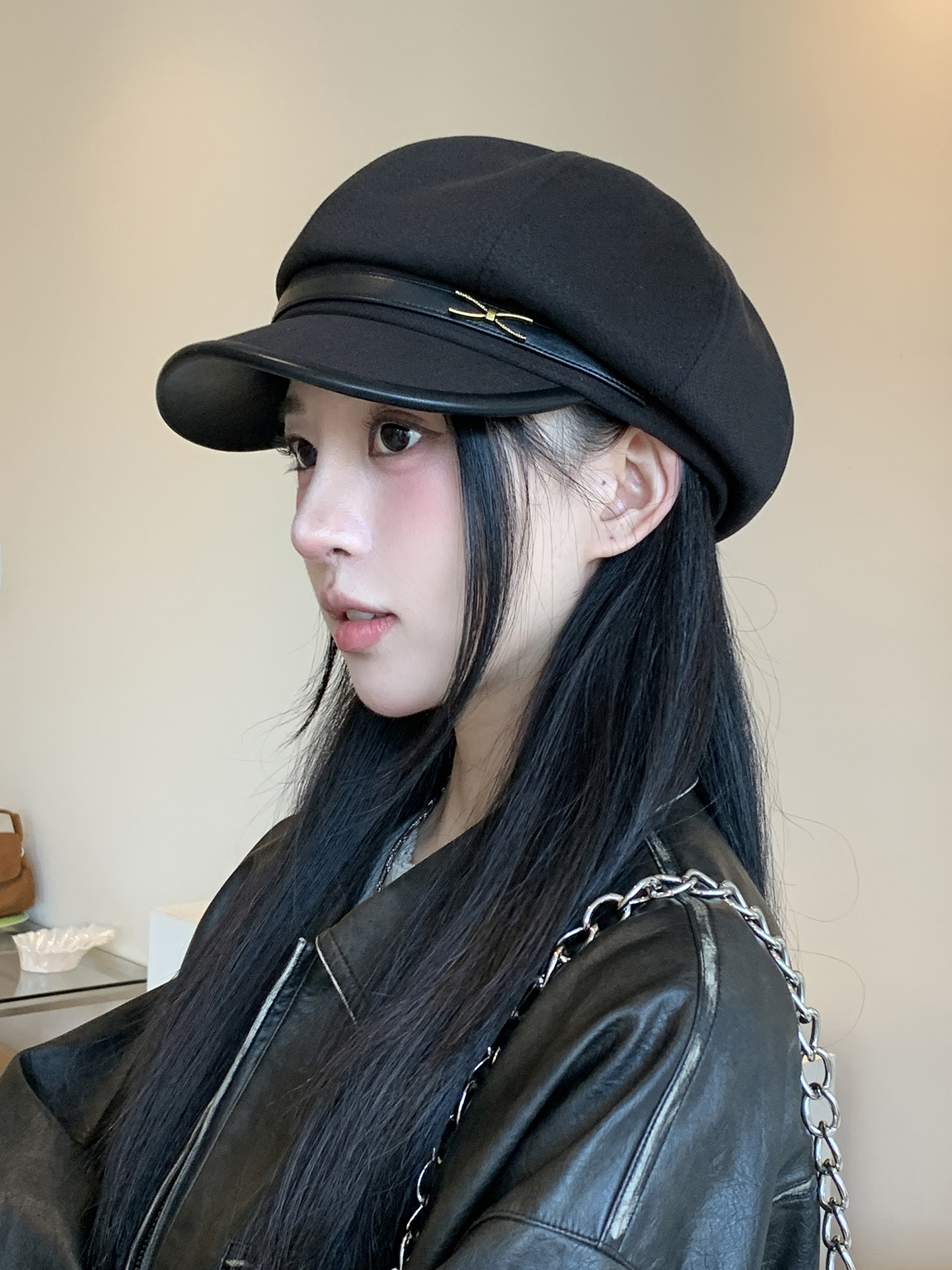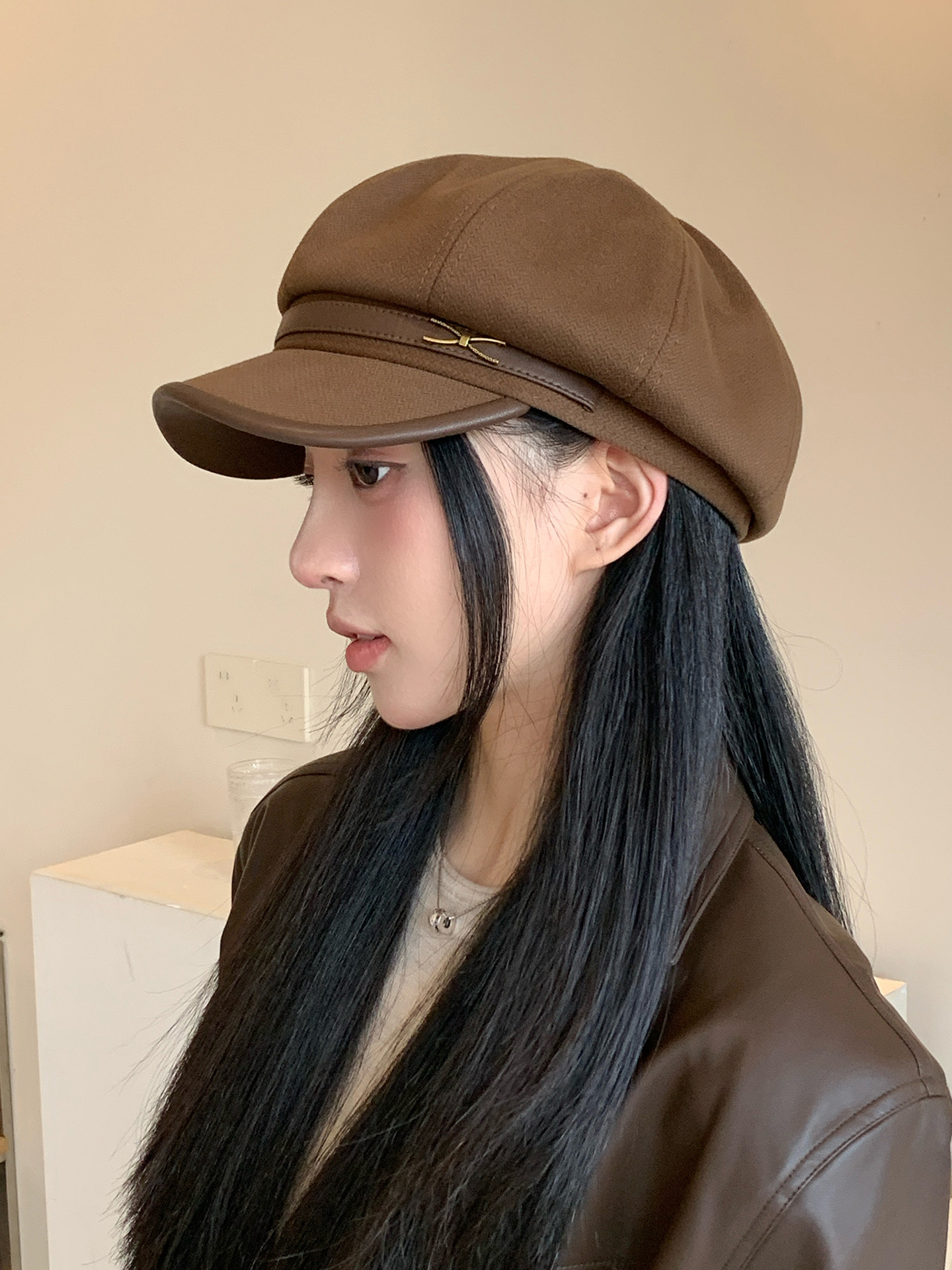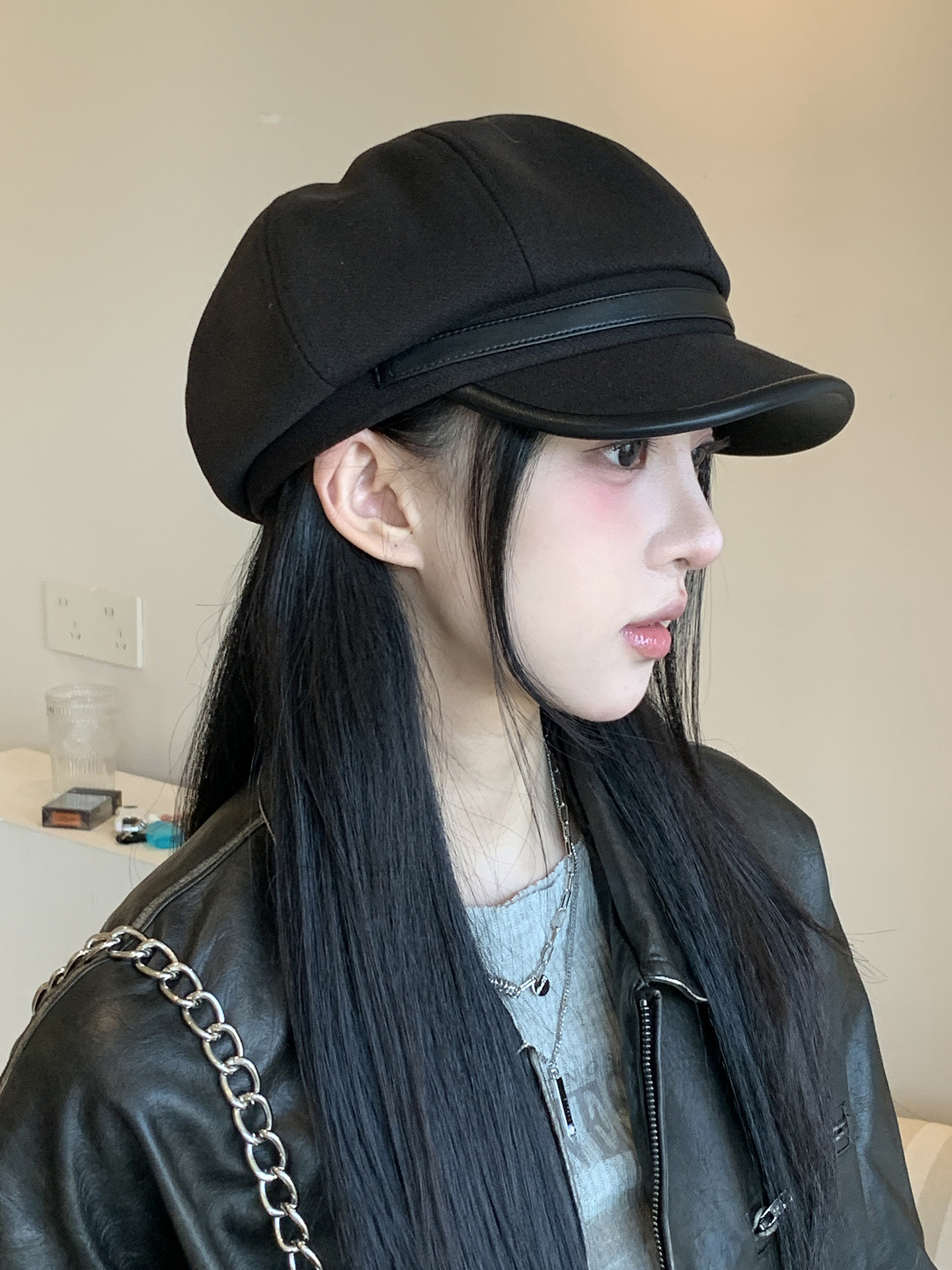 韩版经典小香格纹pu皮拼接八角帽子女春秋季出游百搭显脸小画家帽