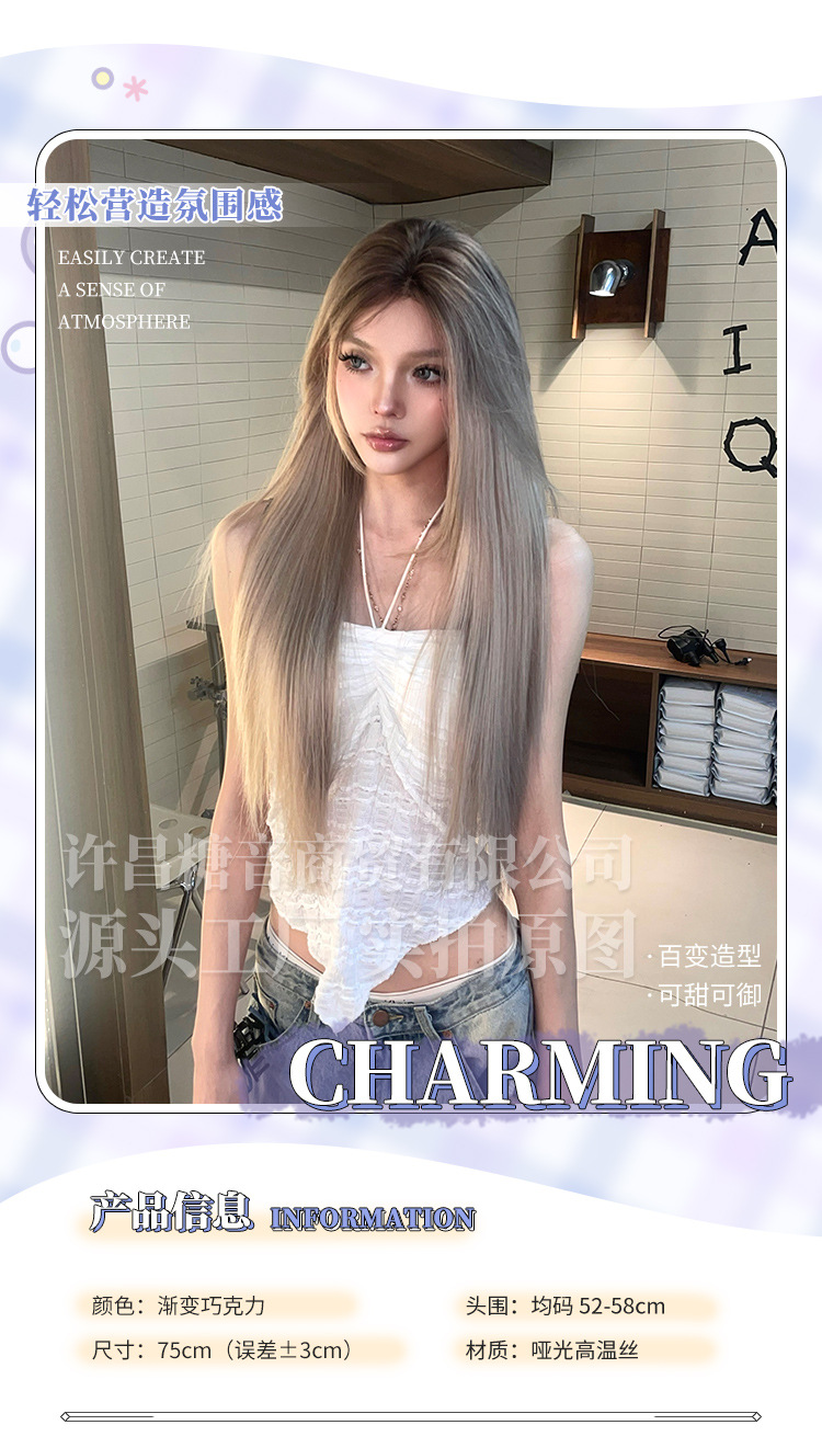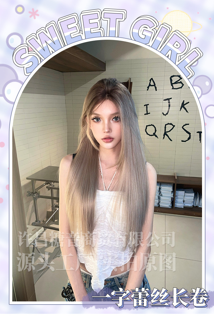 糖音假发长直发女日常小额蕾丝巧克力渐变全头套假发