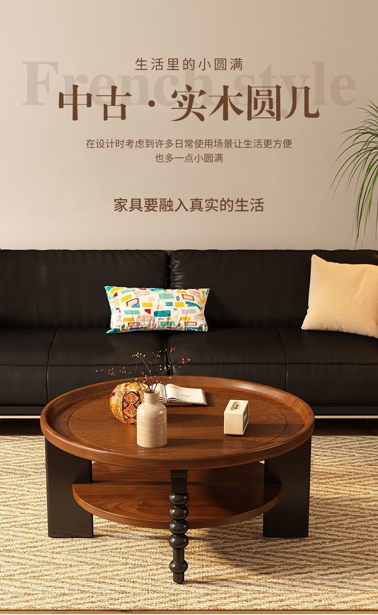 中古风实木茶几圆形法式复古创意茶桌家用小桌子小户型客厅茶几