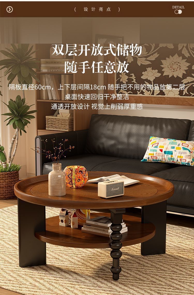 中古风复古圆形茶几家用茶桌客厅小户型美式实木法式新客厅边几