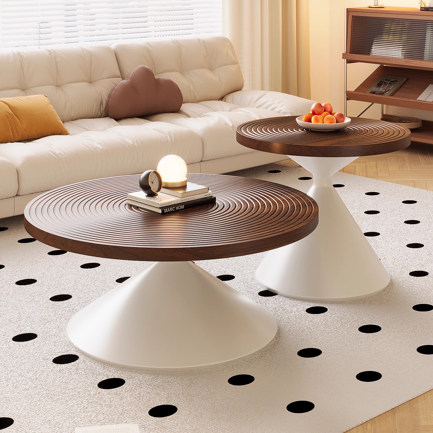 北欧風組み合わせ寝室用コーヒーテーブル、インスタ映えするシンプルで軽やかな高級感、クリーム色の丸型リビングテーブル、モダンな小スペース向け軽奢スタイル