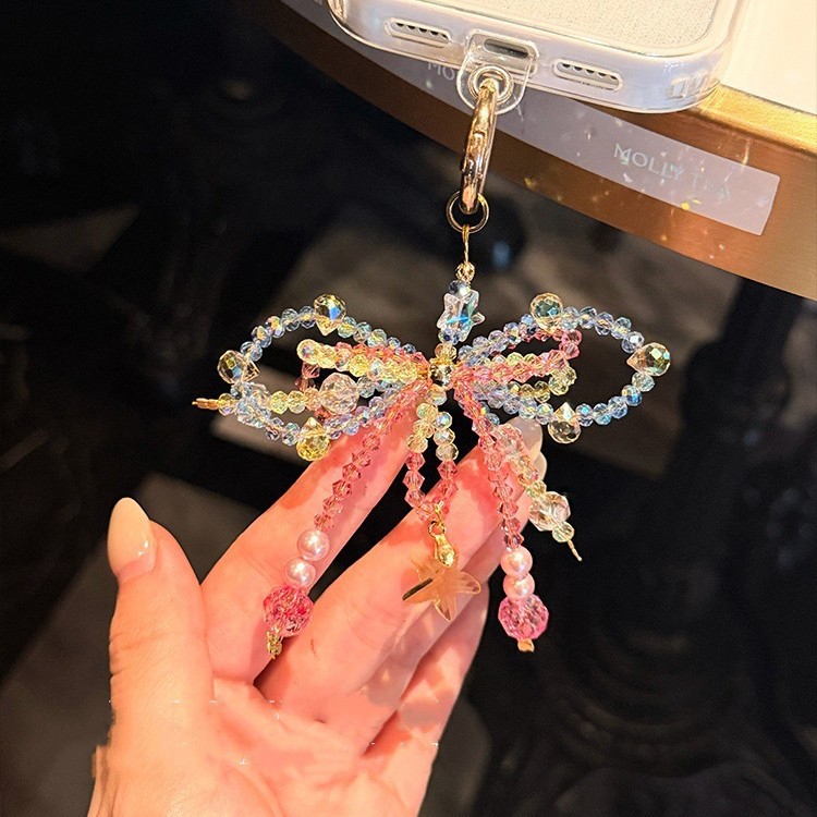 【甜心教主】爆闪甜美粉色串珠蝴蝶结手机链女少女心挂件挂饰新款