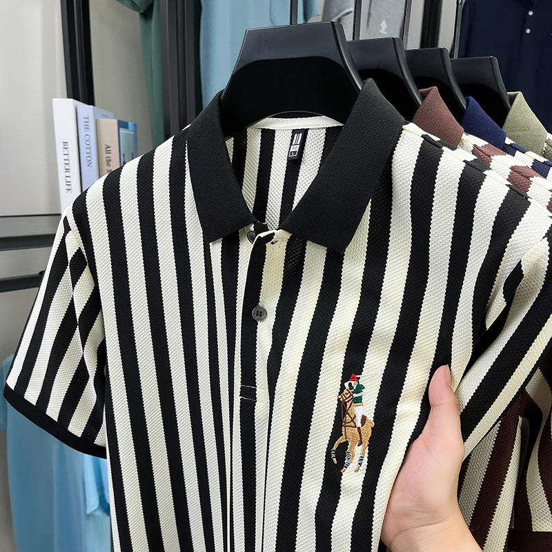 2024年春秋新作メンズポロシャツ、メンズビジネス長袖Tシャツ、メンズラペルカジュアル万能ストライプ