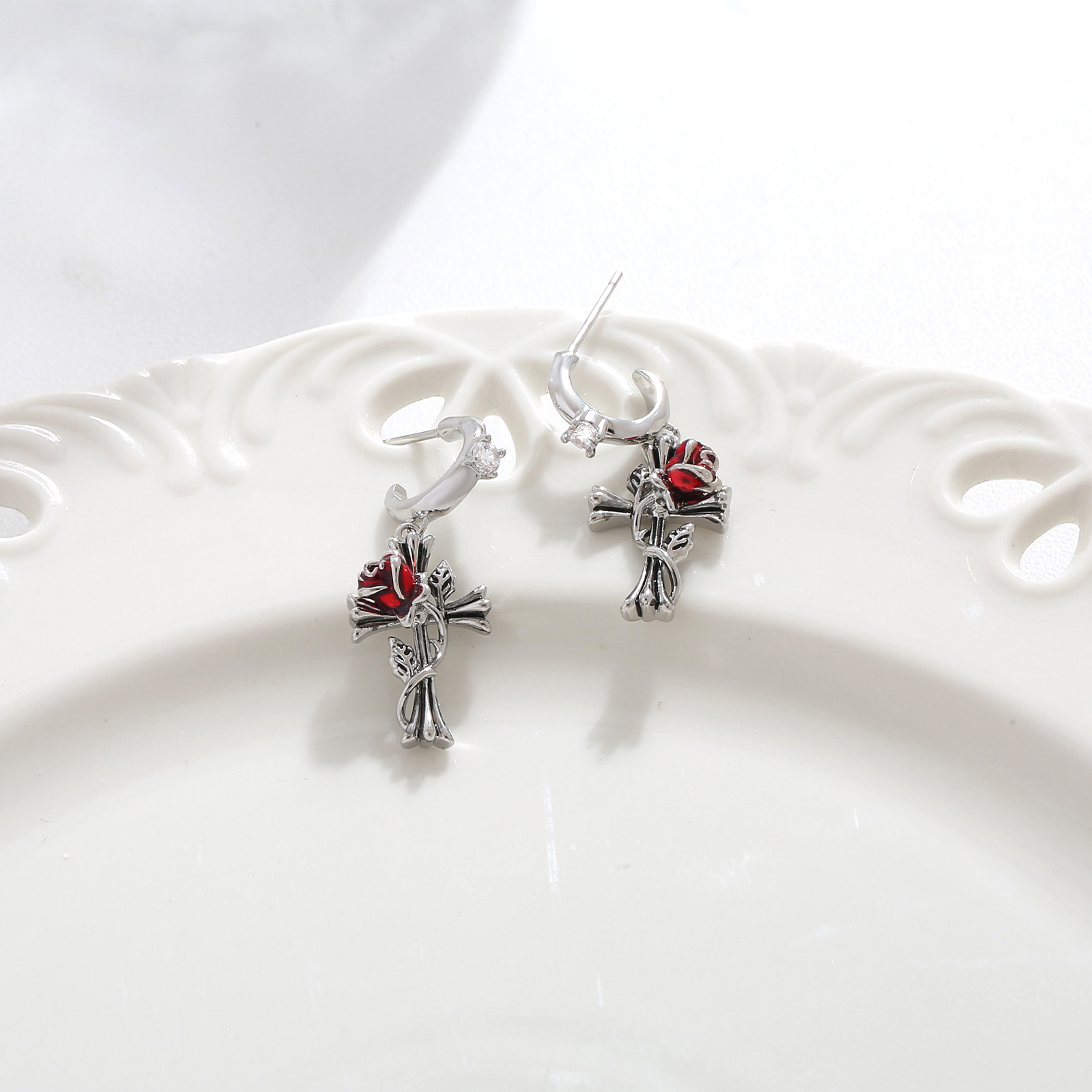 2025时尚 甜酷风黑暗十字架耳钉玫瑰缠绕耳饰轻奢高级感耳环女925