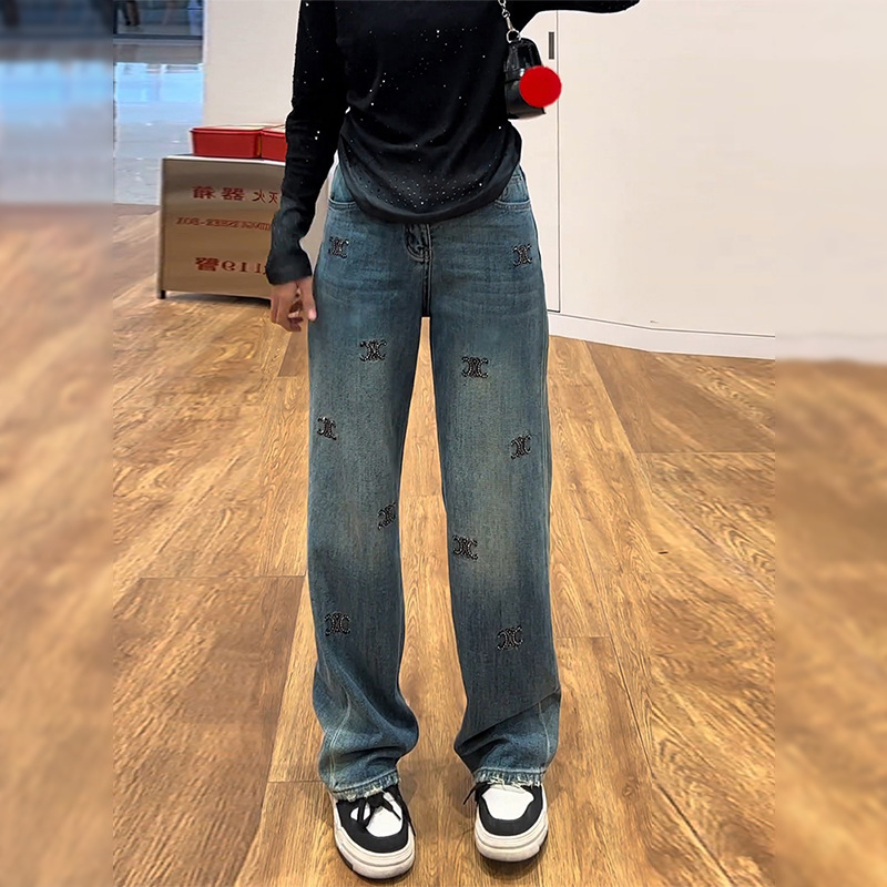 女性のためのブルーホットダイヤモンドジーンズ 2025 夏の新しいスタイルのヘビーデューティハイエンド多用途ハイウエストスリムルーズストレートパンツ