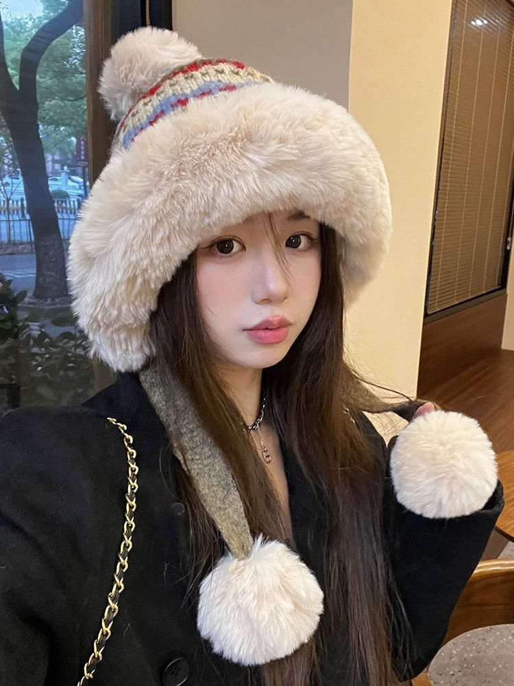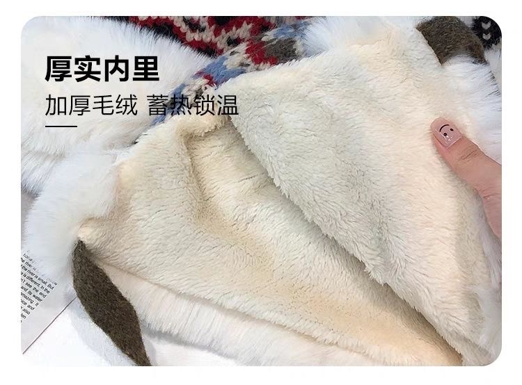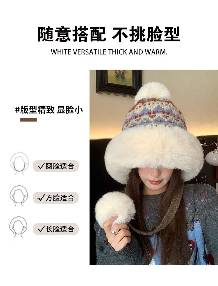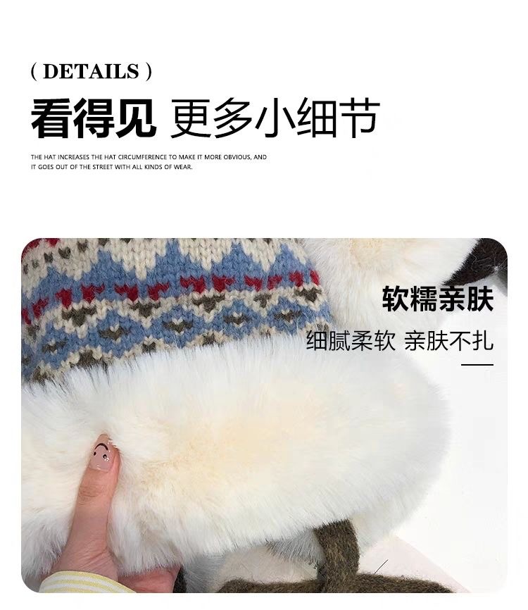 日系民族风提花毛绒帽子女秋冬季加绒雷锋帽出游滑雪帽护耳毛线帽