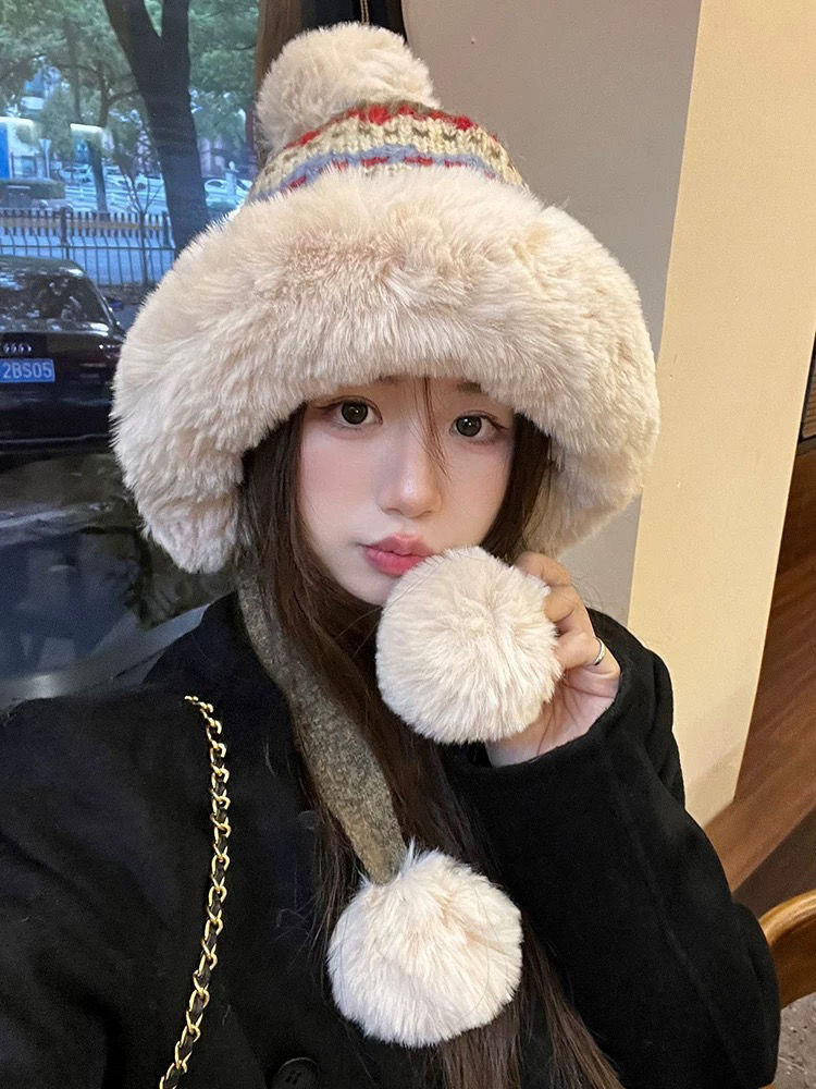 冬暖かい耳保護かわいいぬいぐるみ帽子女性用プラスベルベット厚みのあるニットウール帽子模造毛皮顔が見える小さな雷峰帽子