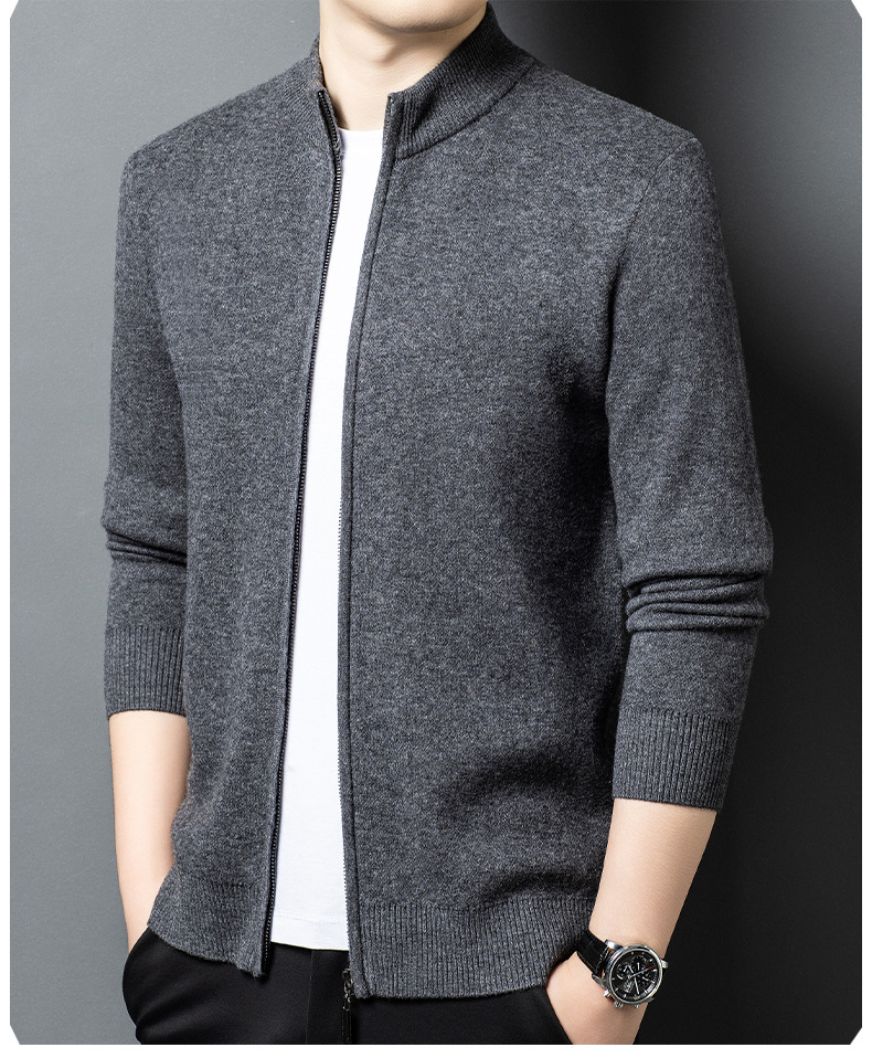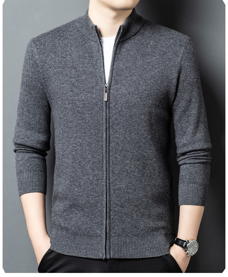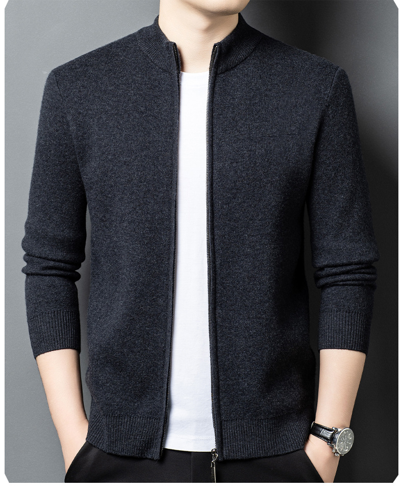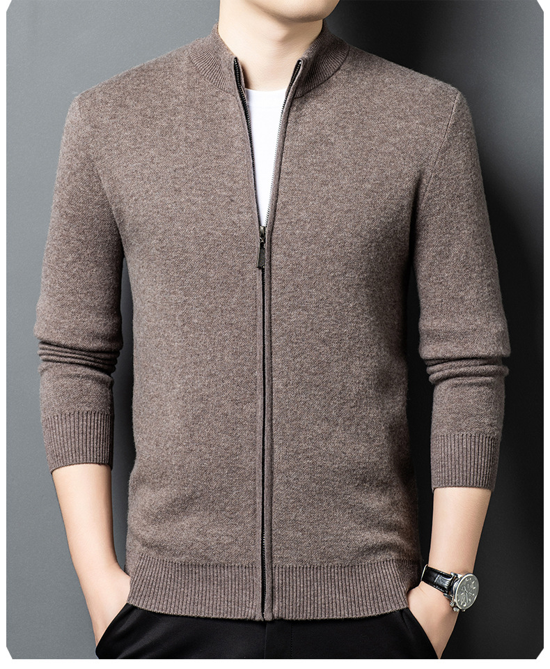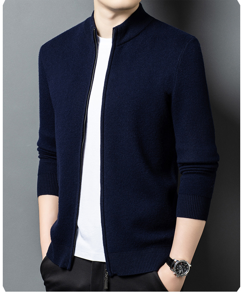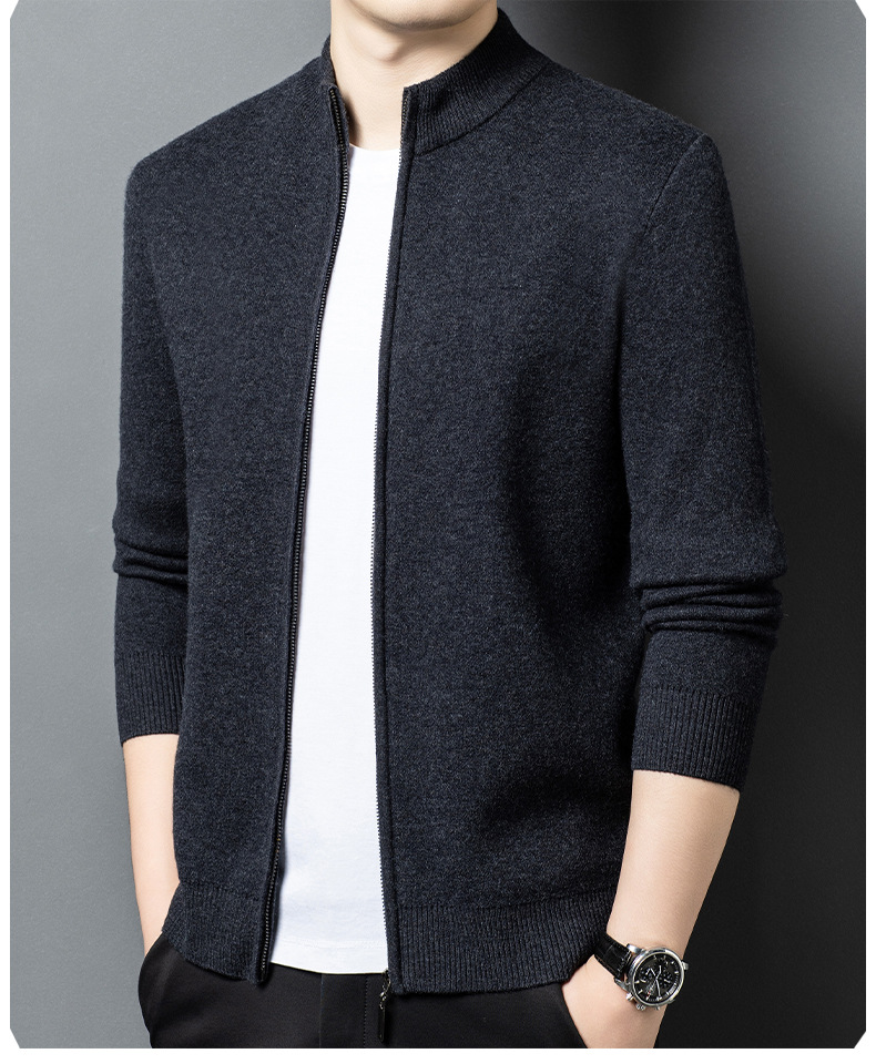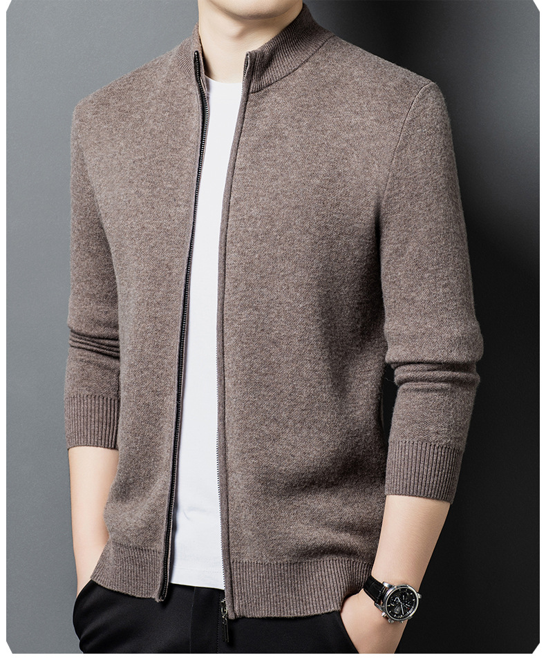 100% 純ウールジッパー立襟ニットカーディガン男性セーター秋冬厚い保温セーターコート男性