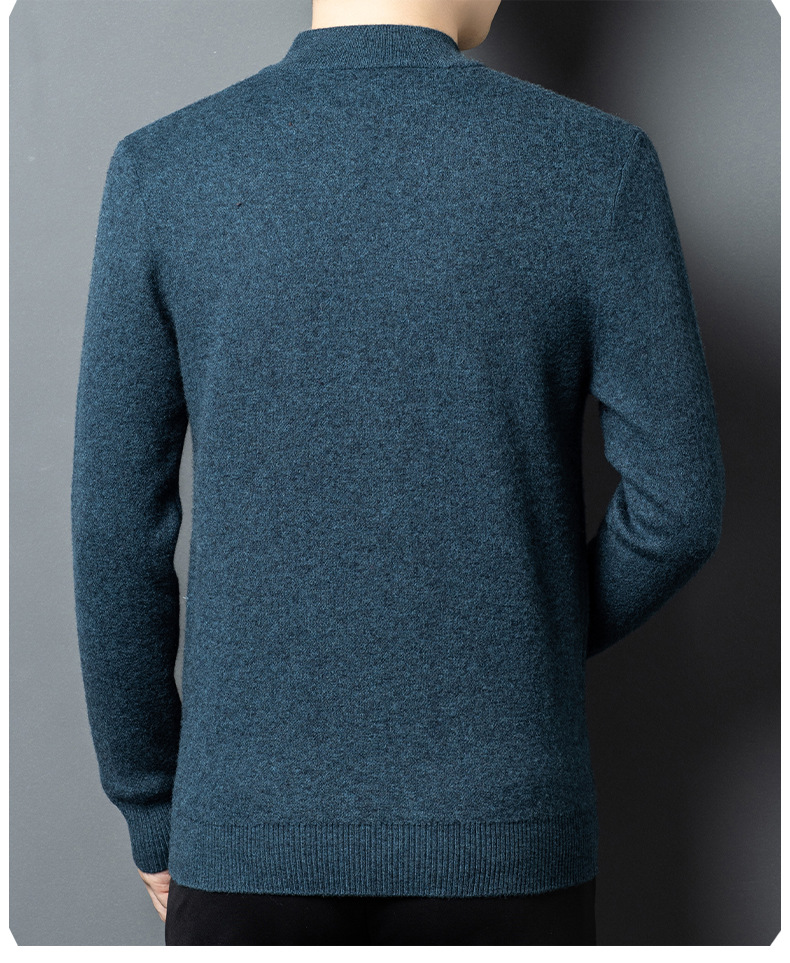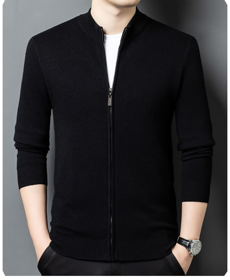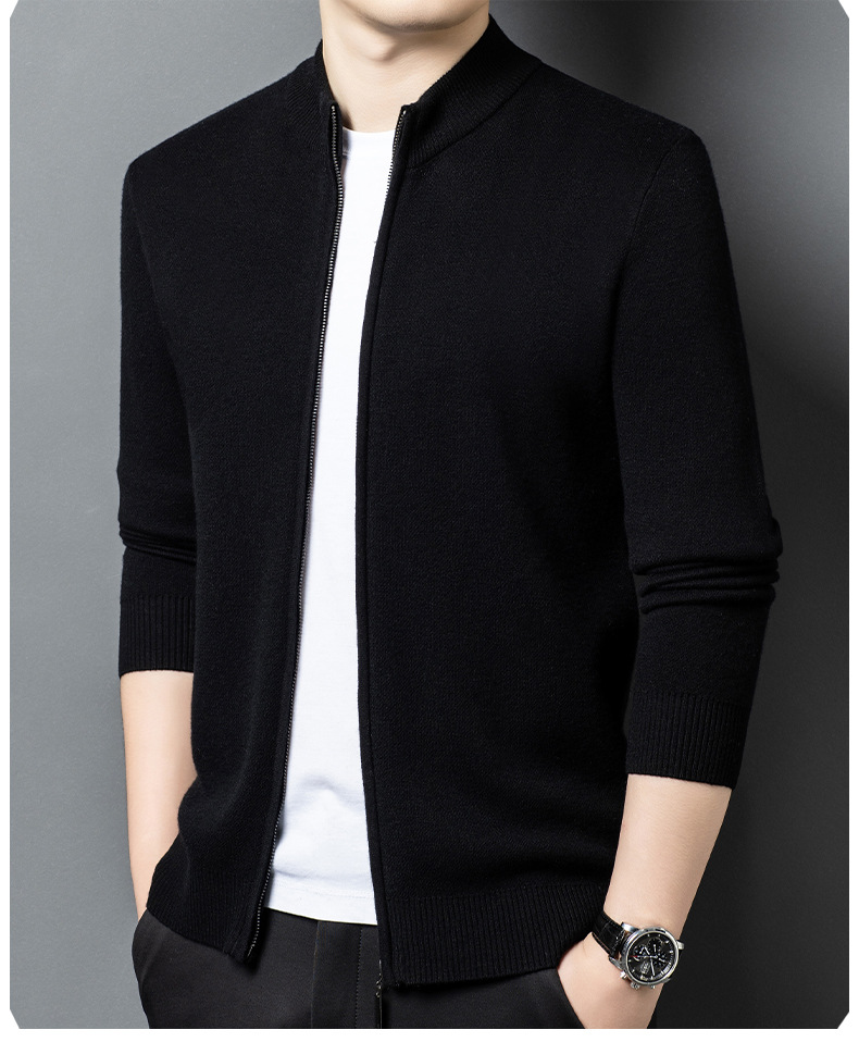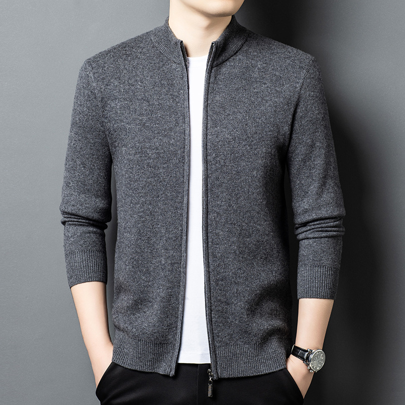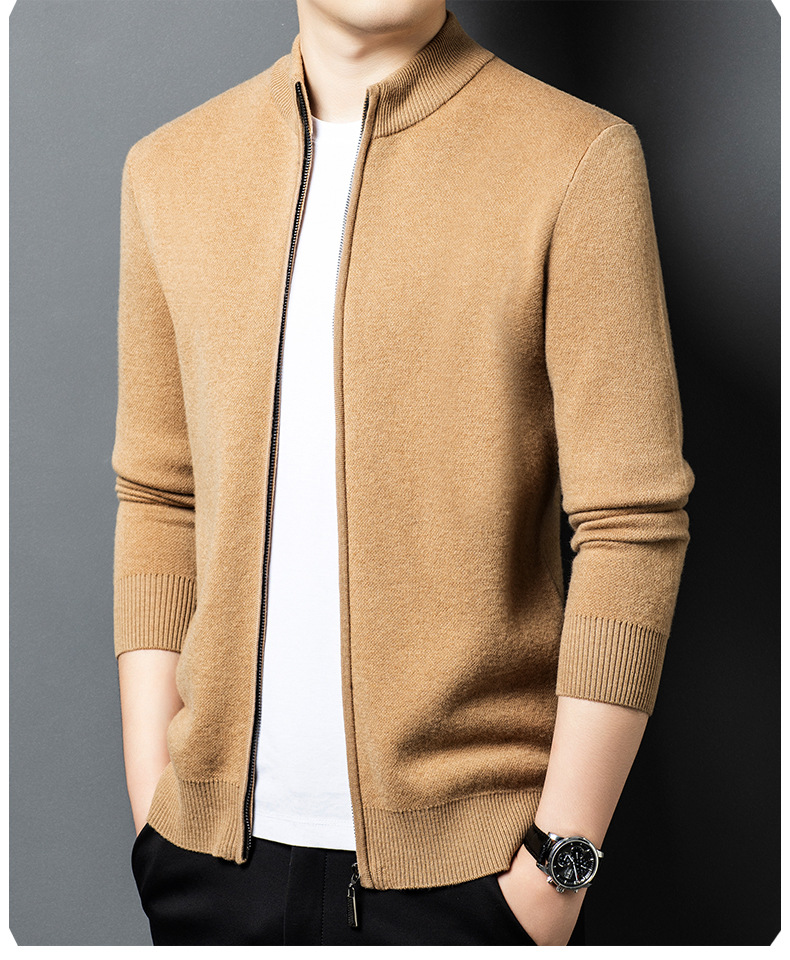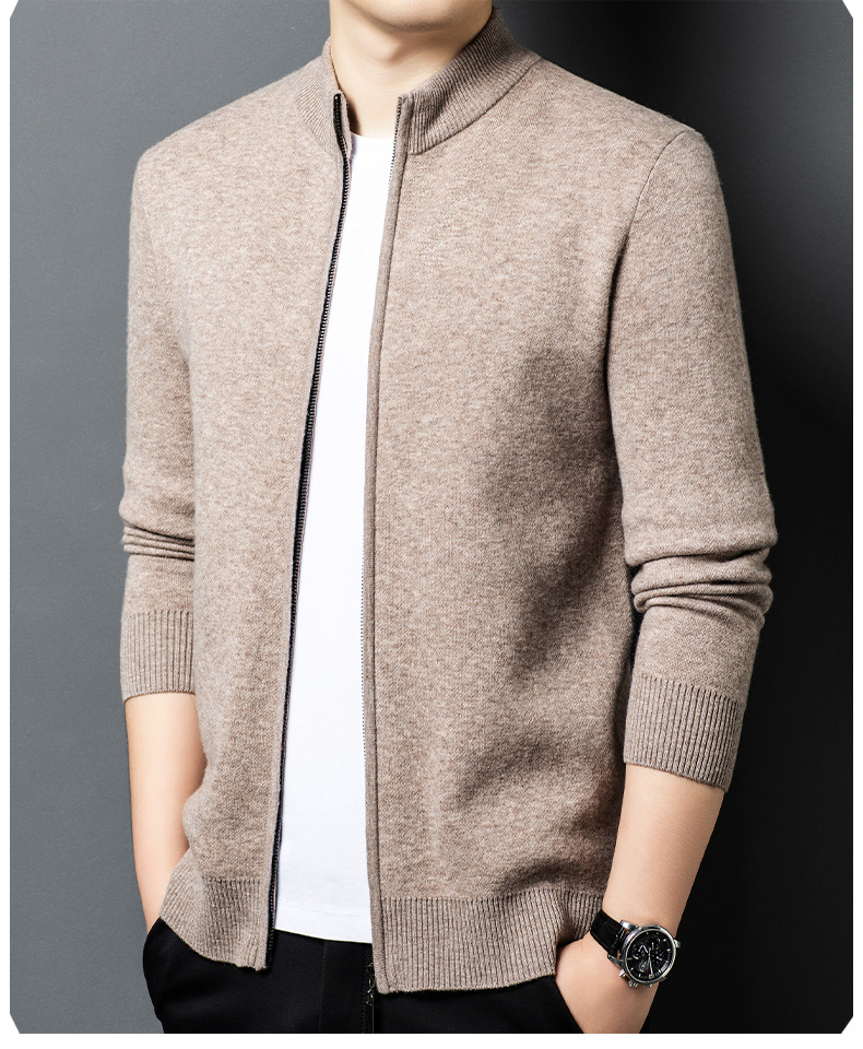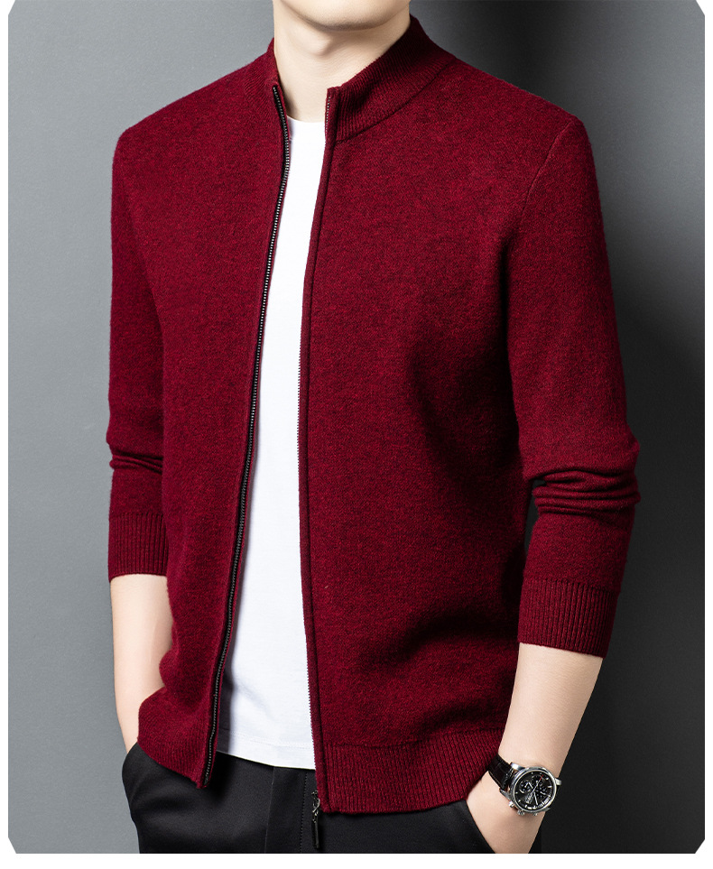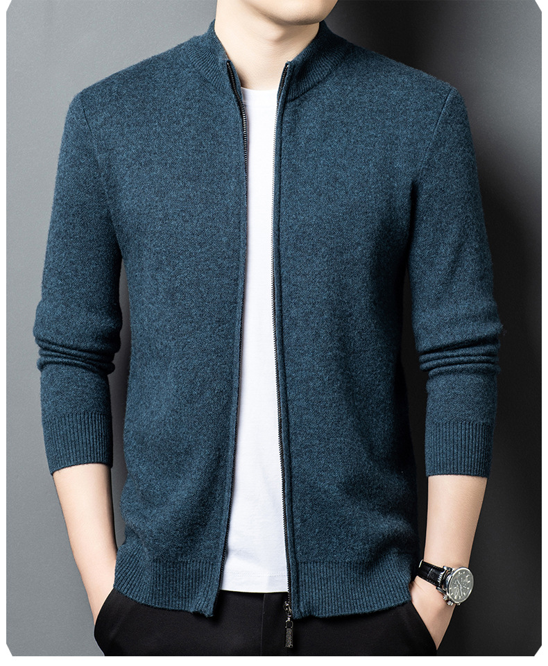 100% 純ウールジッパー立襟ニットカーディガン男性セーター秋冬厚い保温セーターコート男性
