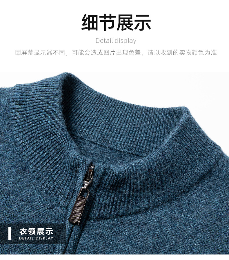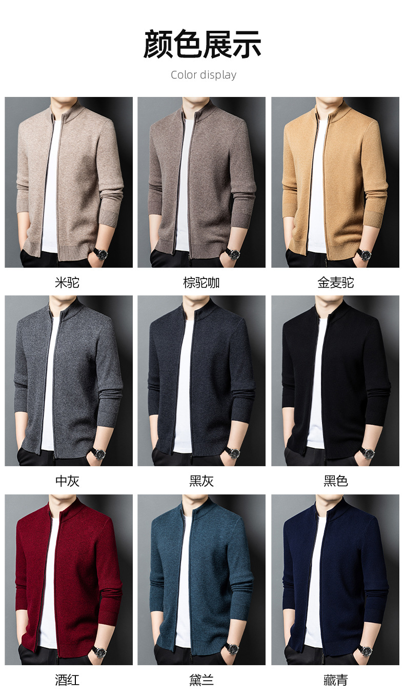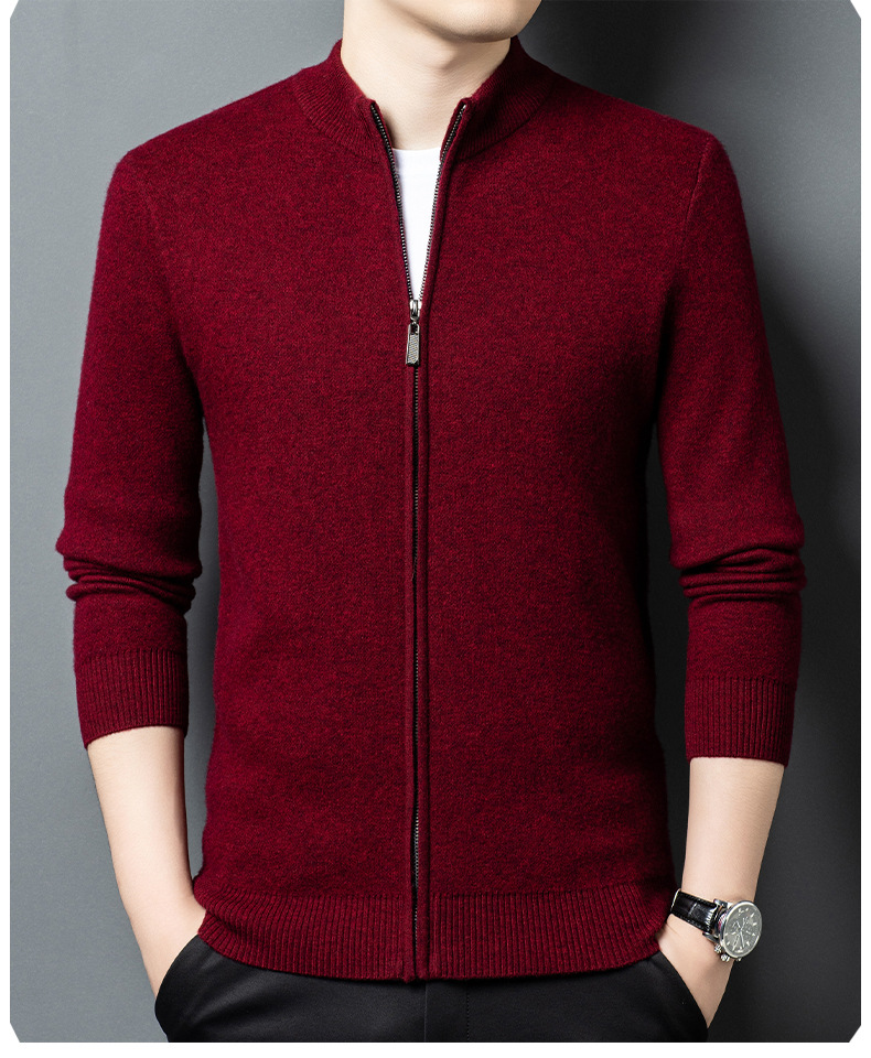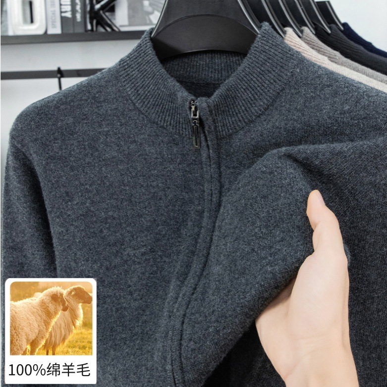 100%羊毛衫男秋冬季新款加厚纯色中年保暖男士拉链立领开衫外套男