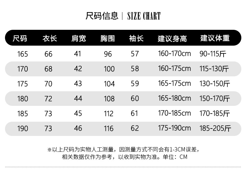 尺码 M-165-105,L-170-110,XL-175-115,XXL-180-120,XXXL-185-125,XXXXL-190-130