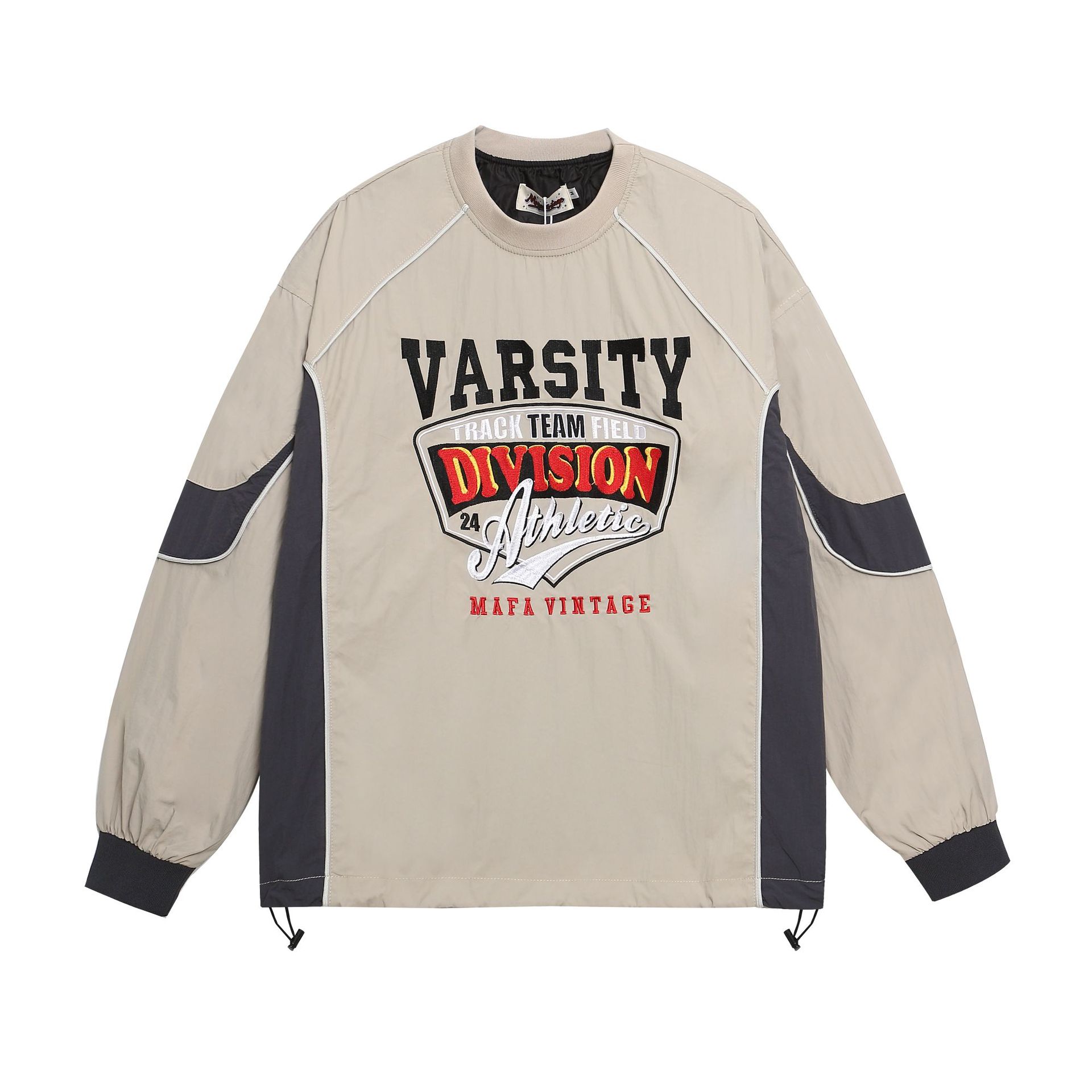 美式复古字母贴布绣运动风情侣V领上衣男女春季插肩撞色长袖卫衣