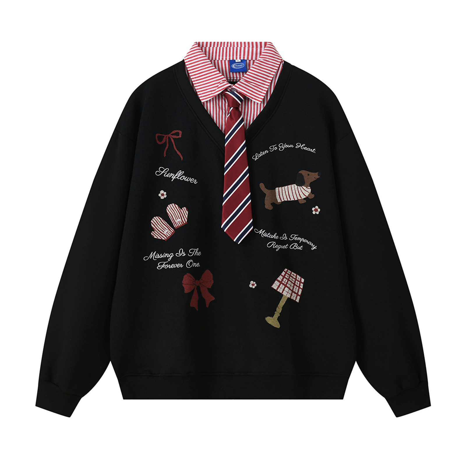 美式复古学院风趣味腊肠狗印花拼接假两件宽松百搭翻领卫衣男女