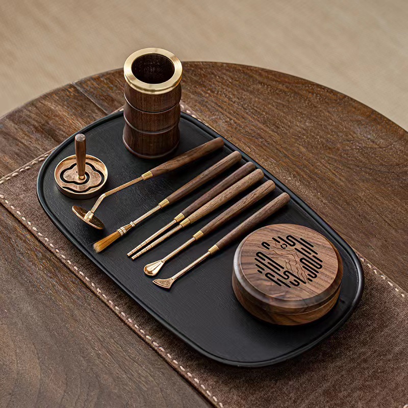 胡桃木合金香篆香压打拓七件套香道配件便携香扫香筷勺香模工具
