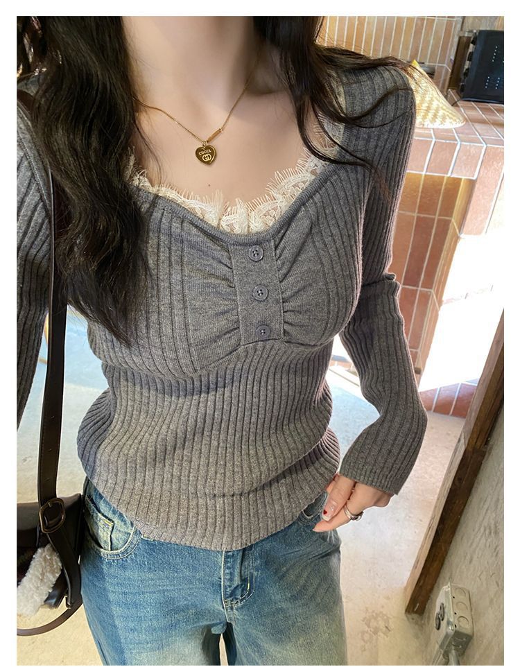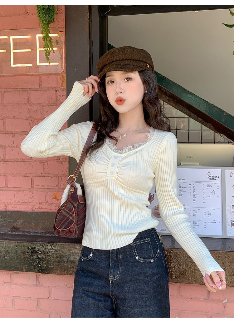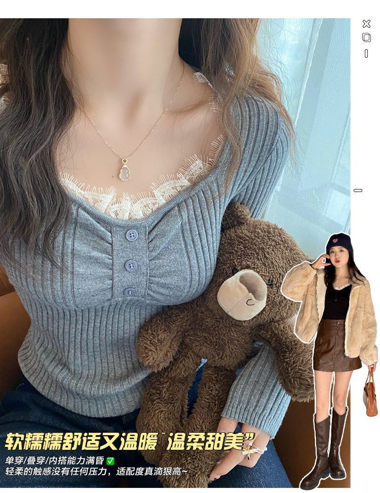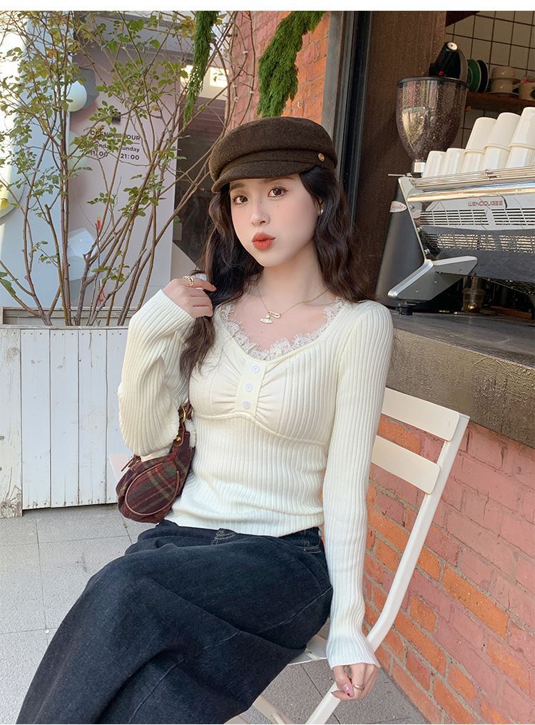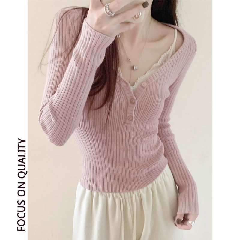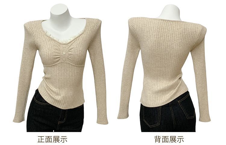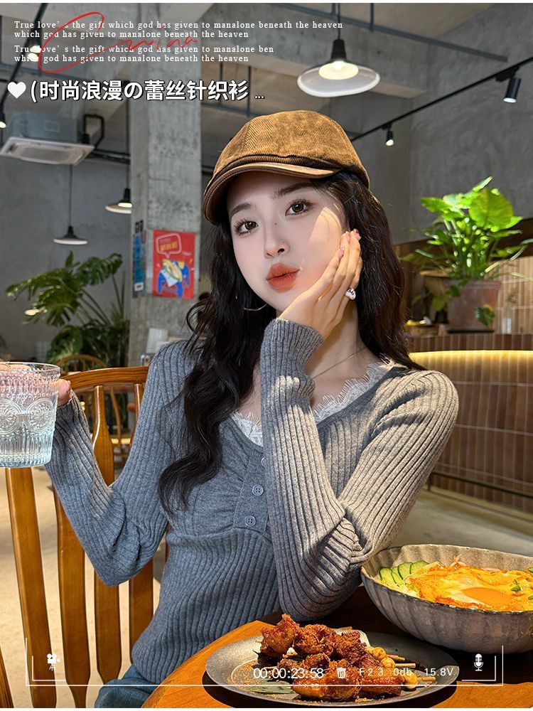 韩系蕾丝拼接纯欲风打底毛衣女早秋穿搭高级感v领针织衫内搭上衣