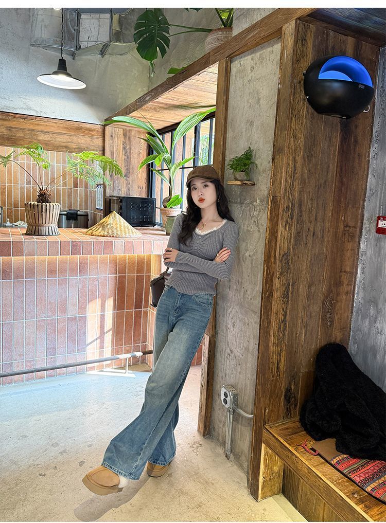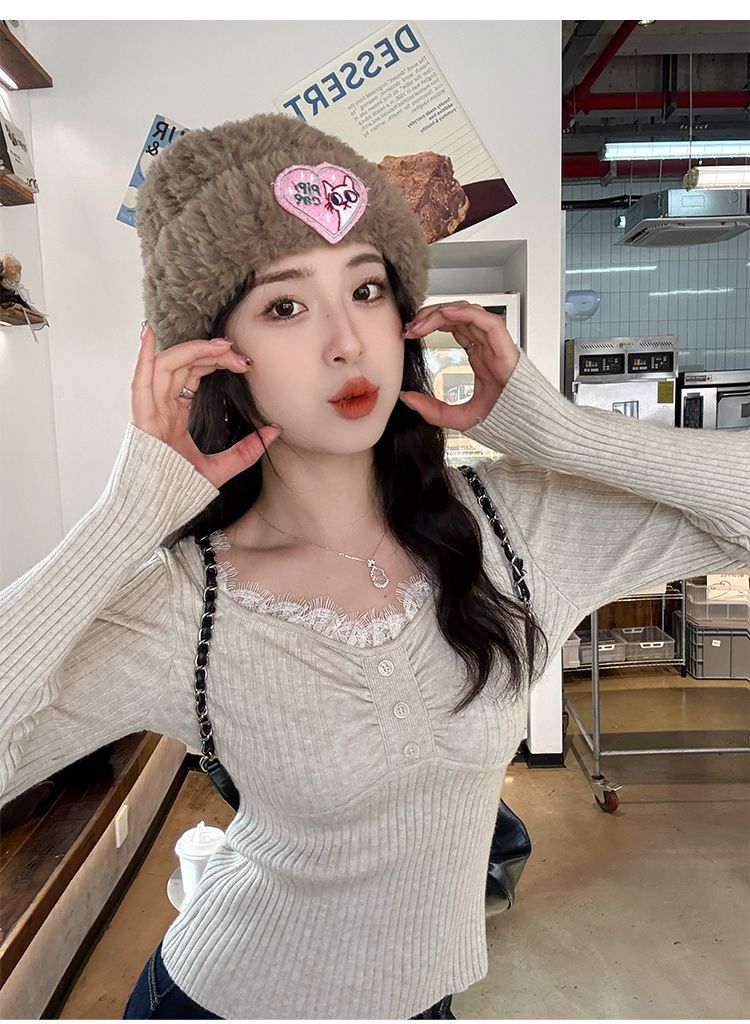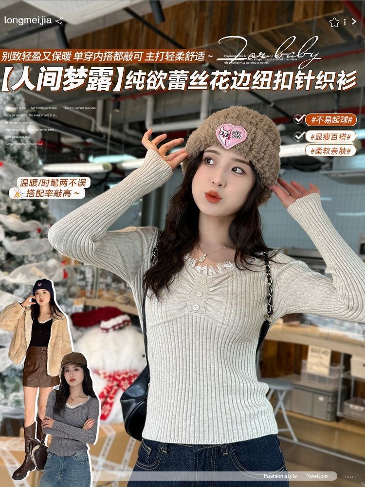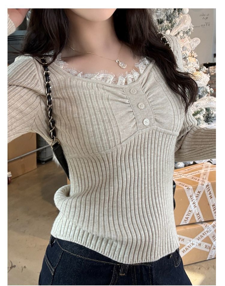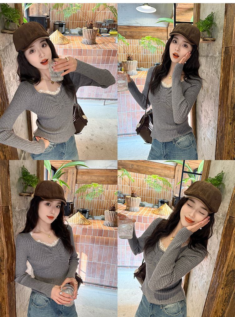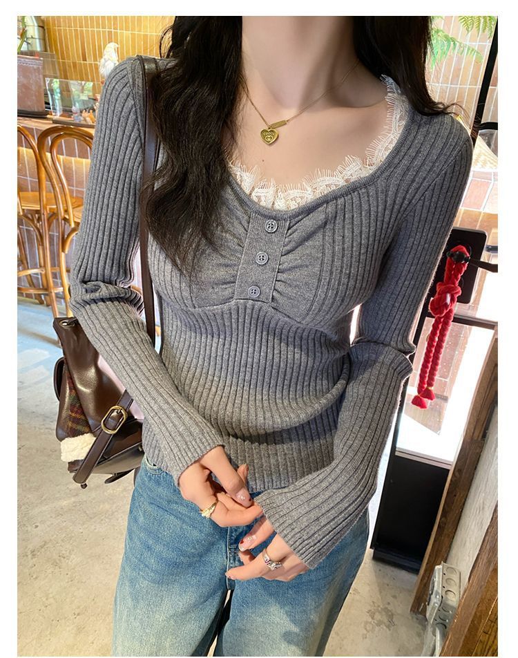 韩系蕾丝拼接纯欲风打底毛衣女早秋穿搭高级感v领针织衫内搭上衣