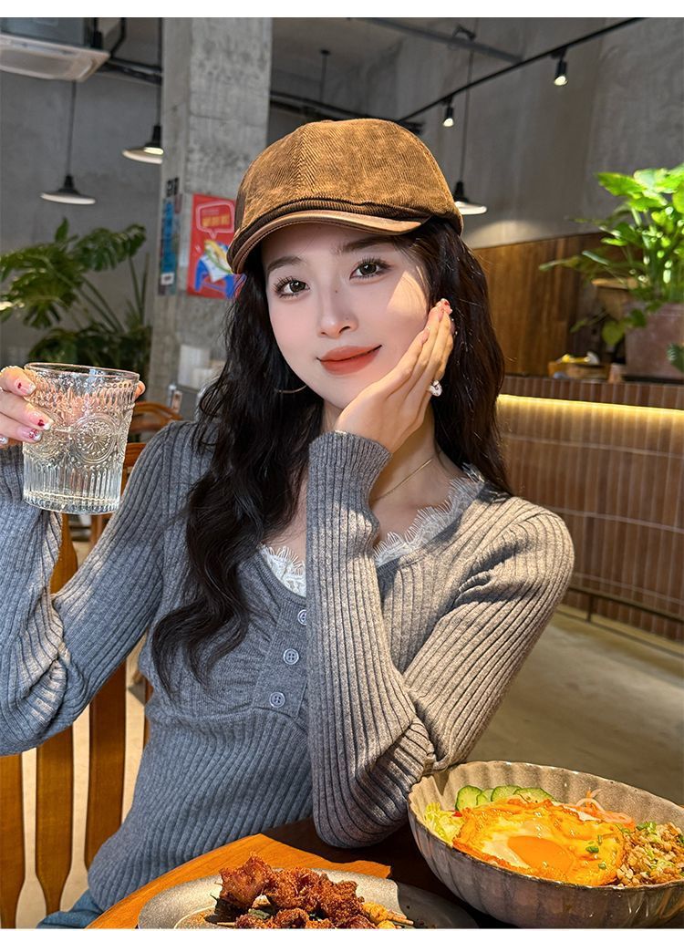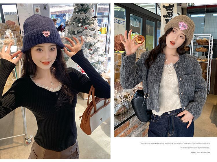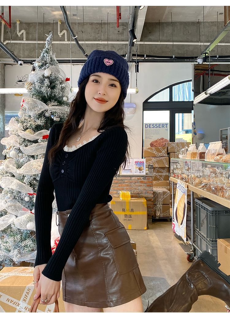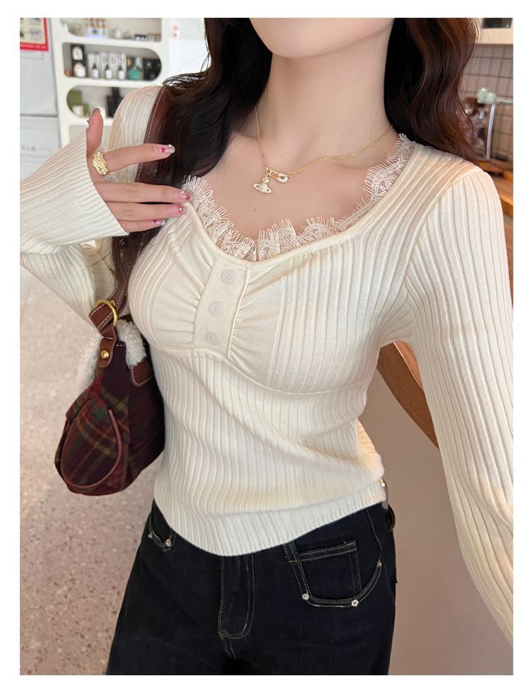 V领蕾丝针织打底衫女款内搭修身2025春季新款高级感毛衣短款上衣
