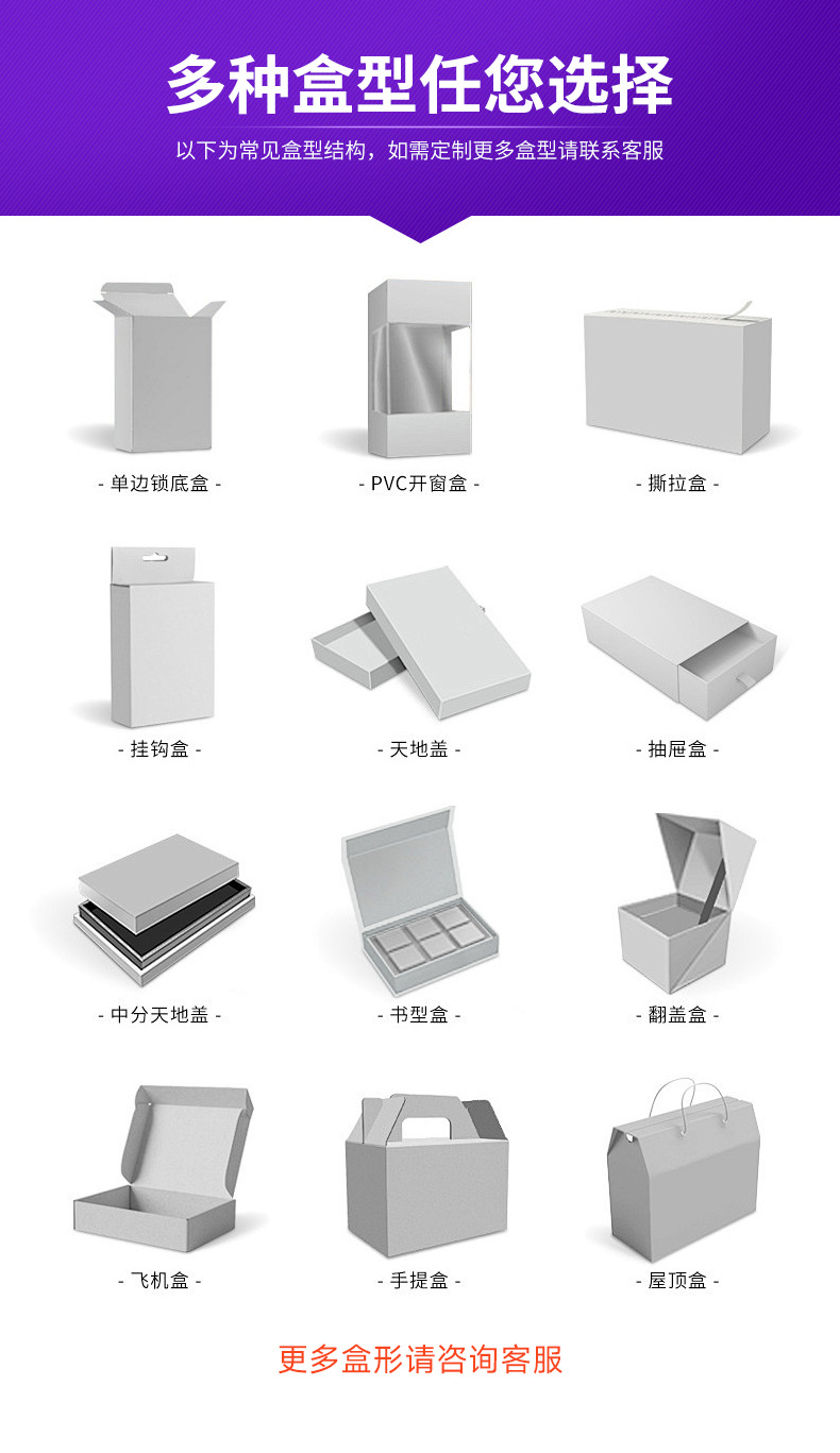 规格型号 抽屉盒;规格可定制,开窗盒;规格可定制,书型盒;规格可定制,天地盖盒;规格可定制,盒型可定制;规格可定制