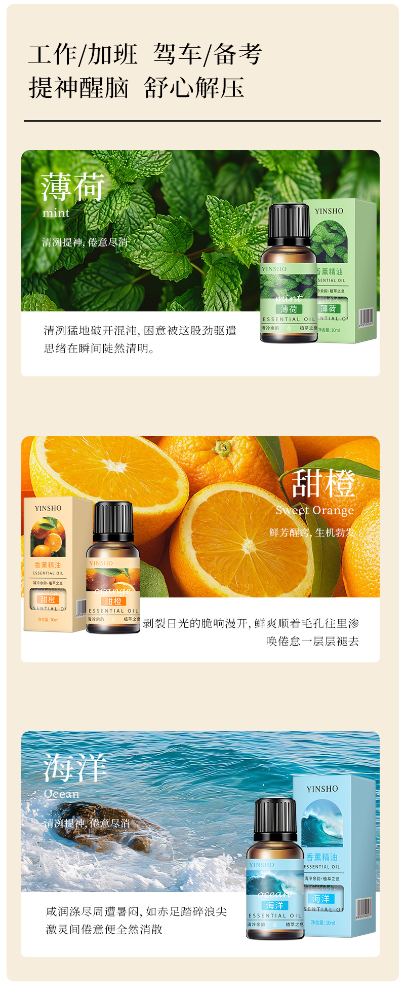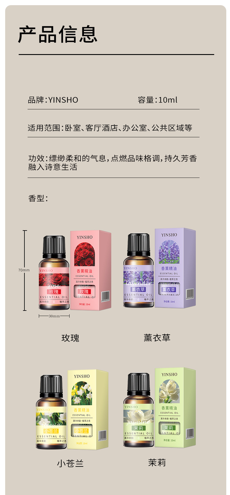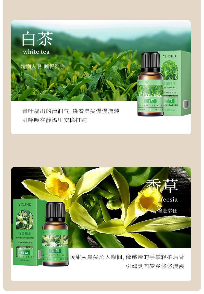 香型 玫瑰香薰精油(油溶性)10ml/盒,薰衣草香薰精油(油溶性)10ml/盒,小苍兰香薰精油(油溶性)10ml/盒,茉莉香薰精油(油溶性)10ml/盒,白茶香薰精油(油溶性)10ml/盒,海洋香薰精油(油溶性)10ml/盒,甜橙香薰精油(油溶性)10ml/盒,栀子香薰精油(油溶性)10ml/盒,香草香薰精油(油溶性)10ml/盒,薄荷香薰精油(油溶性)10ml/盒