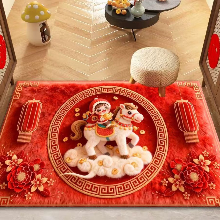 新款马年新年红色喜庆家用入户玄关门垫入户门垫新年水晶绒地毯
