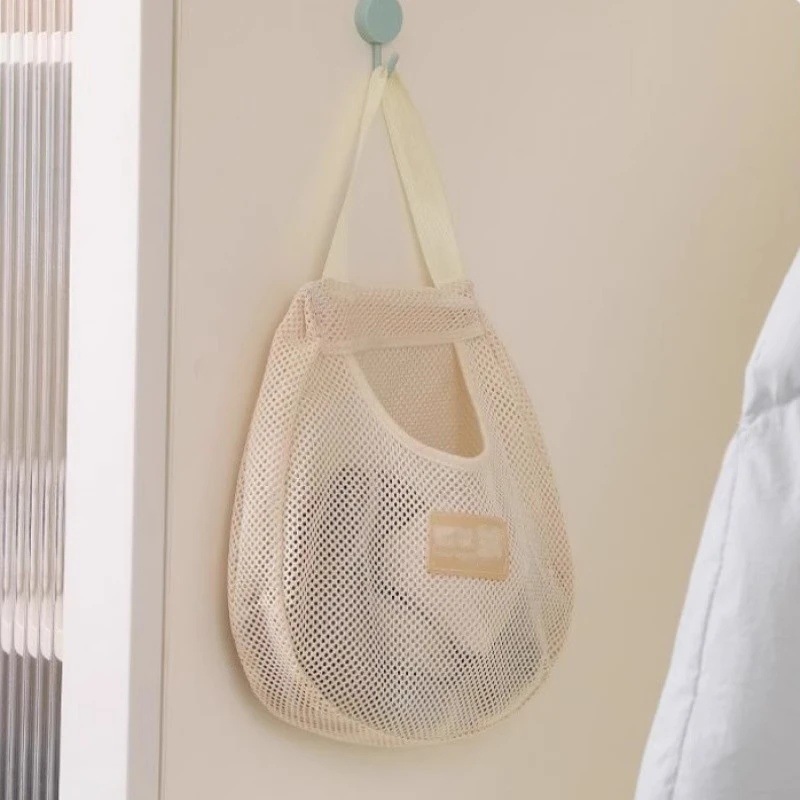 日本式の靴下の収納は袋を掛けます。トイレは吊り式の網袋を掛けます。