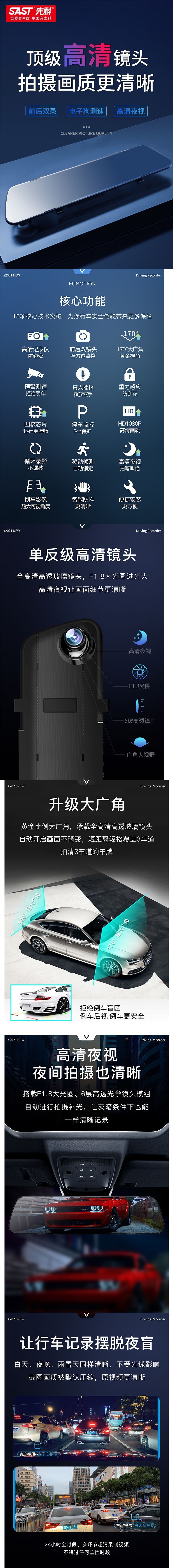 先科行车记录仪高清夜视度全景车载前后双录倒车影像带电子狗
